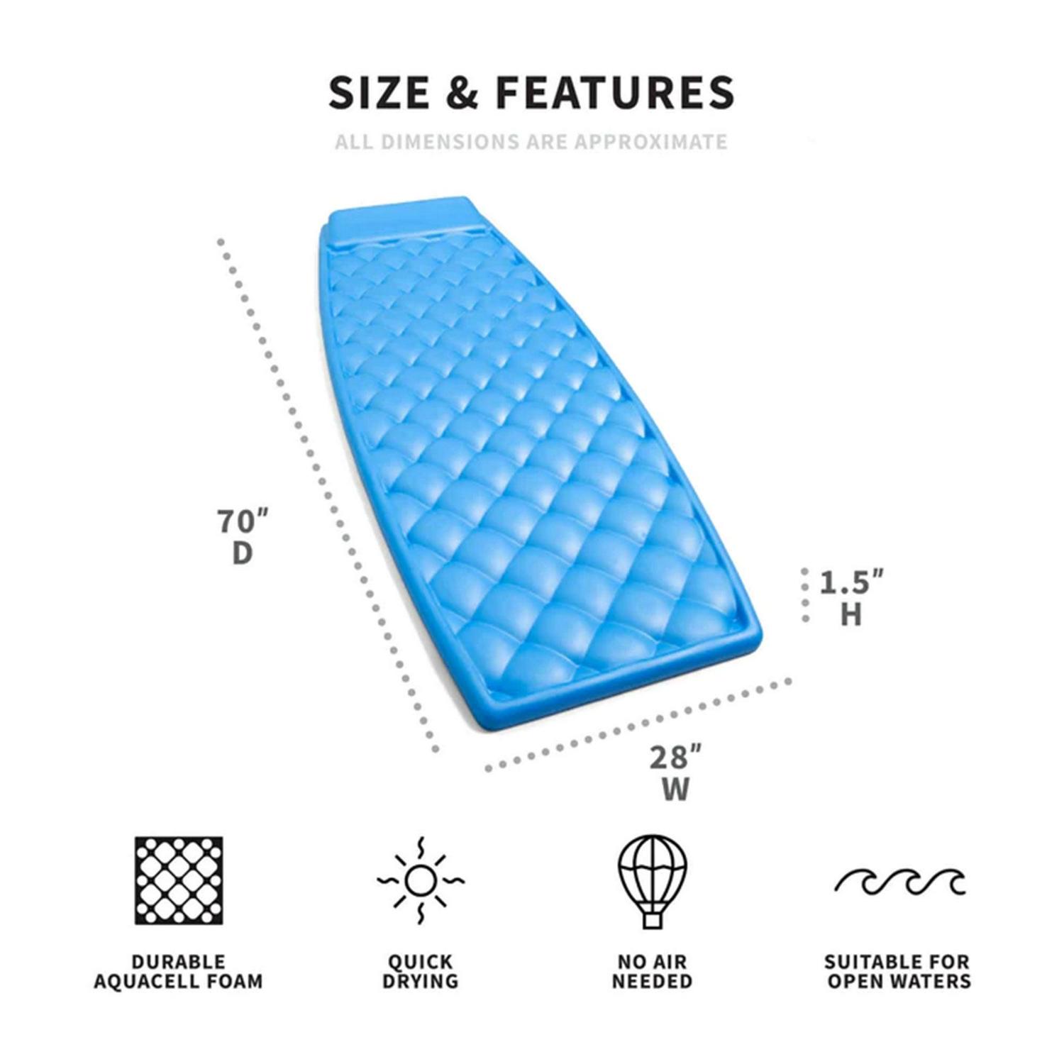 – Luxuriously soft, this pool float provides full-body support and includes a quilted satin finish and integrated pillow for the ultimate floating comfort.