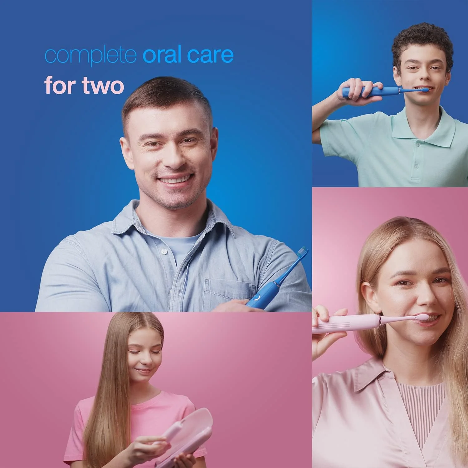 Complete oral care solution for two users with dual electric toothbrushes Powerful 40,000 vibrations per minute motors for effective plaque removal 3 unique brushing modes, including whitening and gum health settings Long-lasting 30-day battery life for extended use between charges Smart timers with vibrating notifications for proper brushing duration 10 DuPont-engineered replacement brush heads included 2 BPA-free hard-shell travel cases for convenient on-the-go use Stylish design in baby pink and coral blue colors Comprehensive set with all necessary accessories (brush heads, cases, charging cables) Suitable for couples, families, or individual users seeking advanced oral care technology