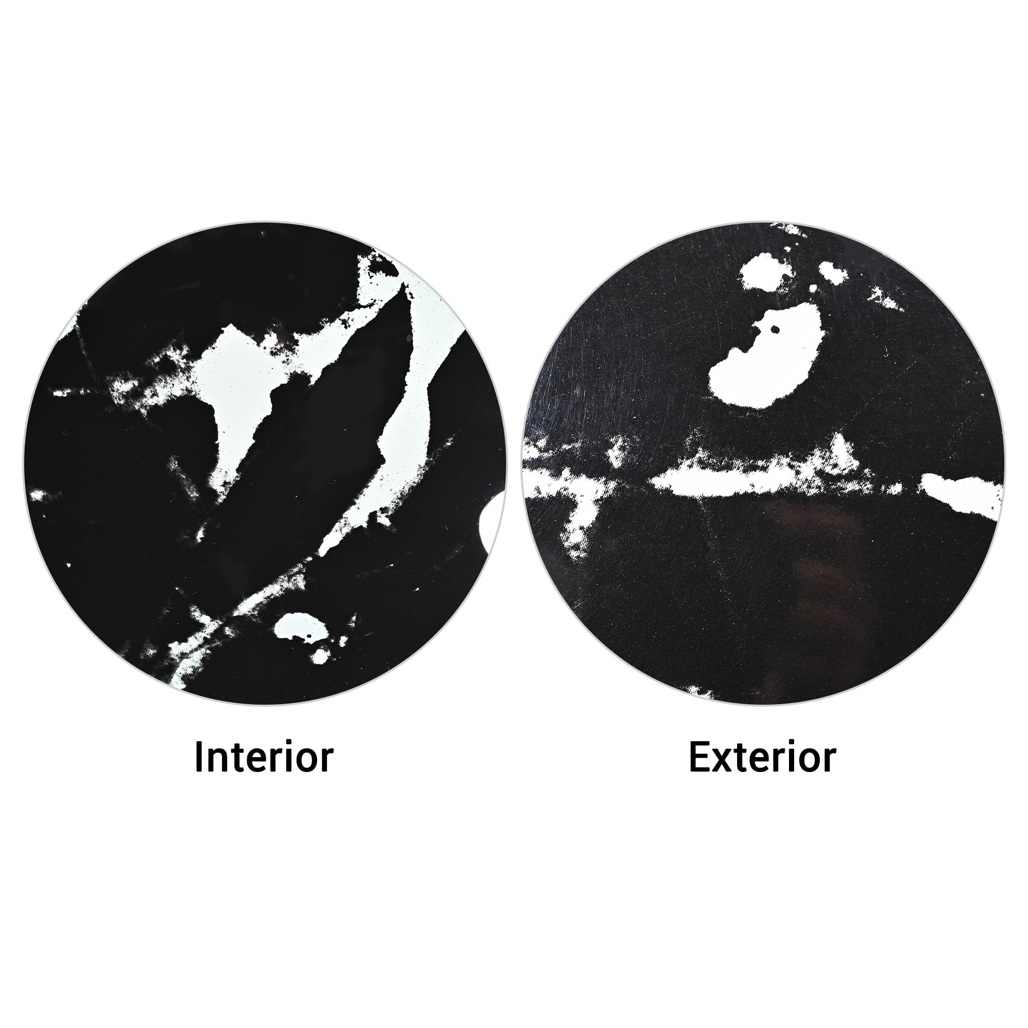 Round shape vessel sink, solid tempered glass construction Contemporary and sleek marbling pattern, fits perfectly with any bathroom decor Overall dimension (Dia. x H): 16-1/2″ x 5-3/4″; Drain hole dia.: 1-3/4″ Glossy glass interior, scratch resistant and easy to clean up Without overflow; Easy countertop installation