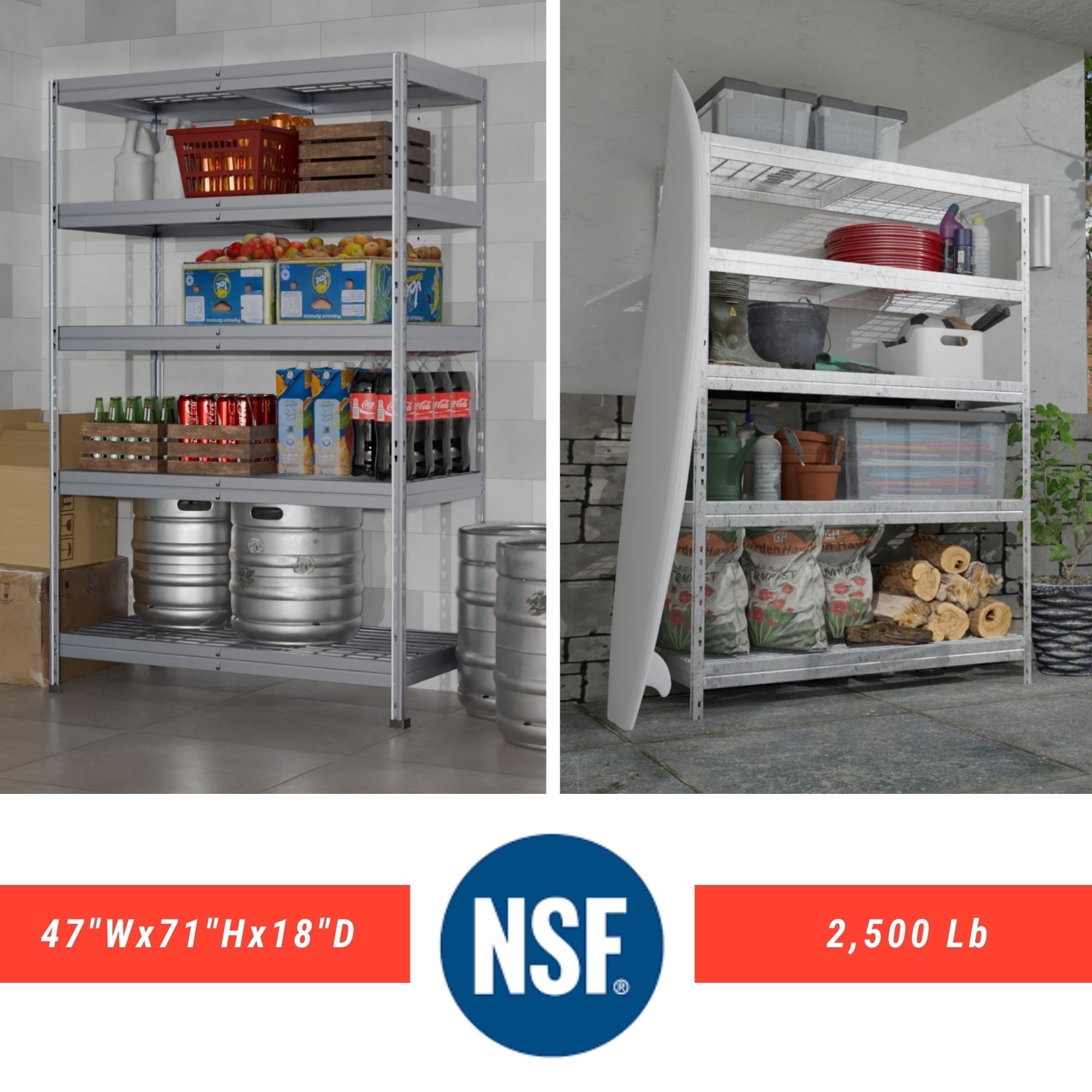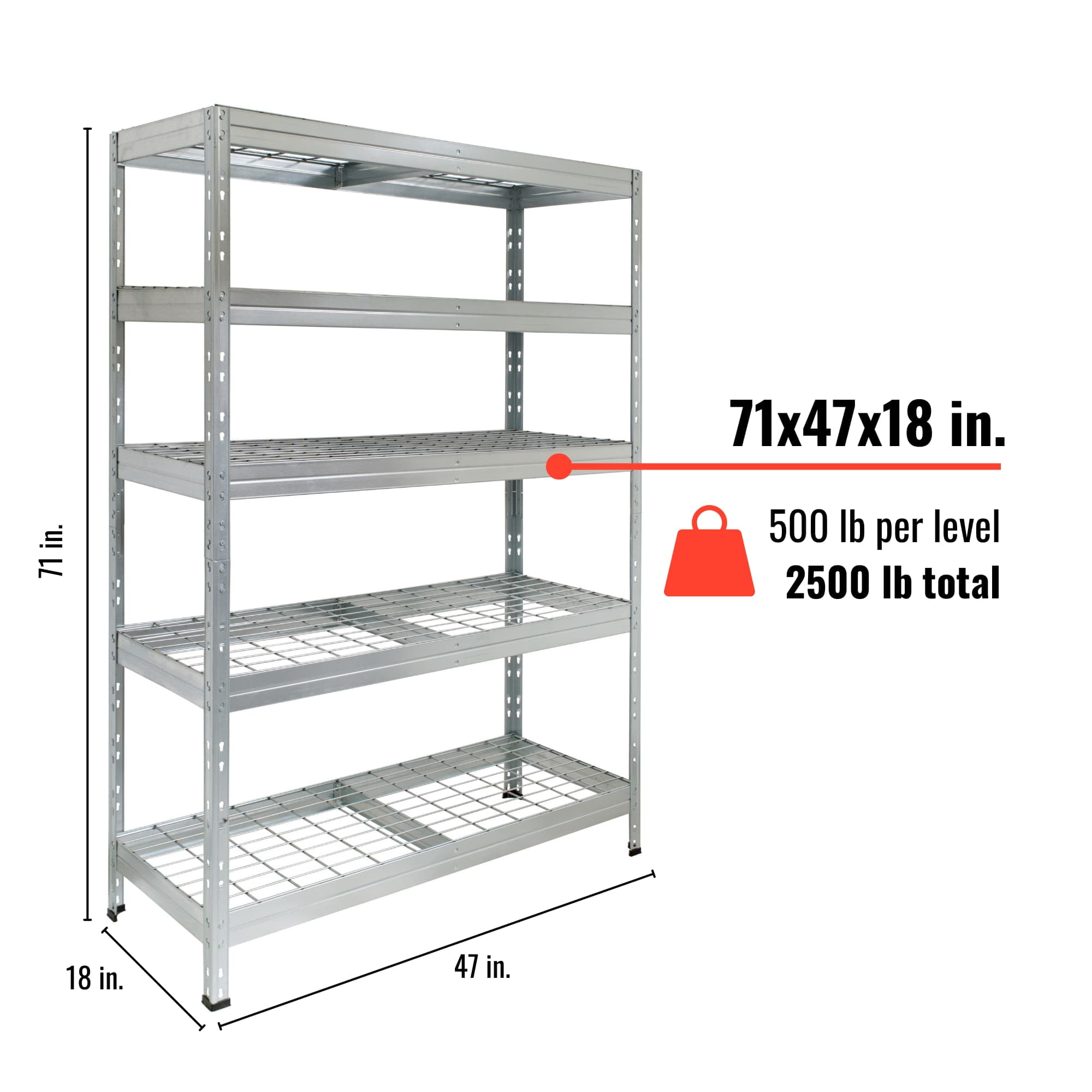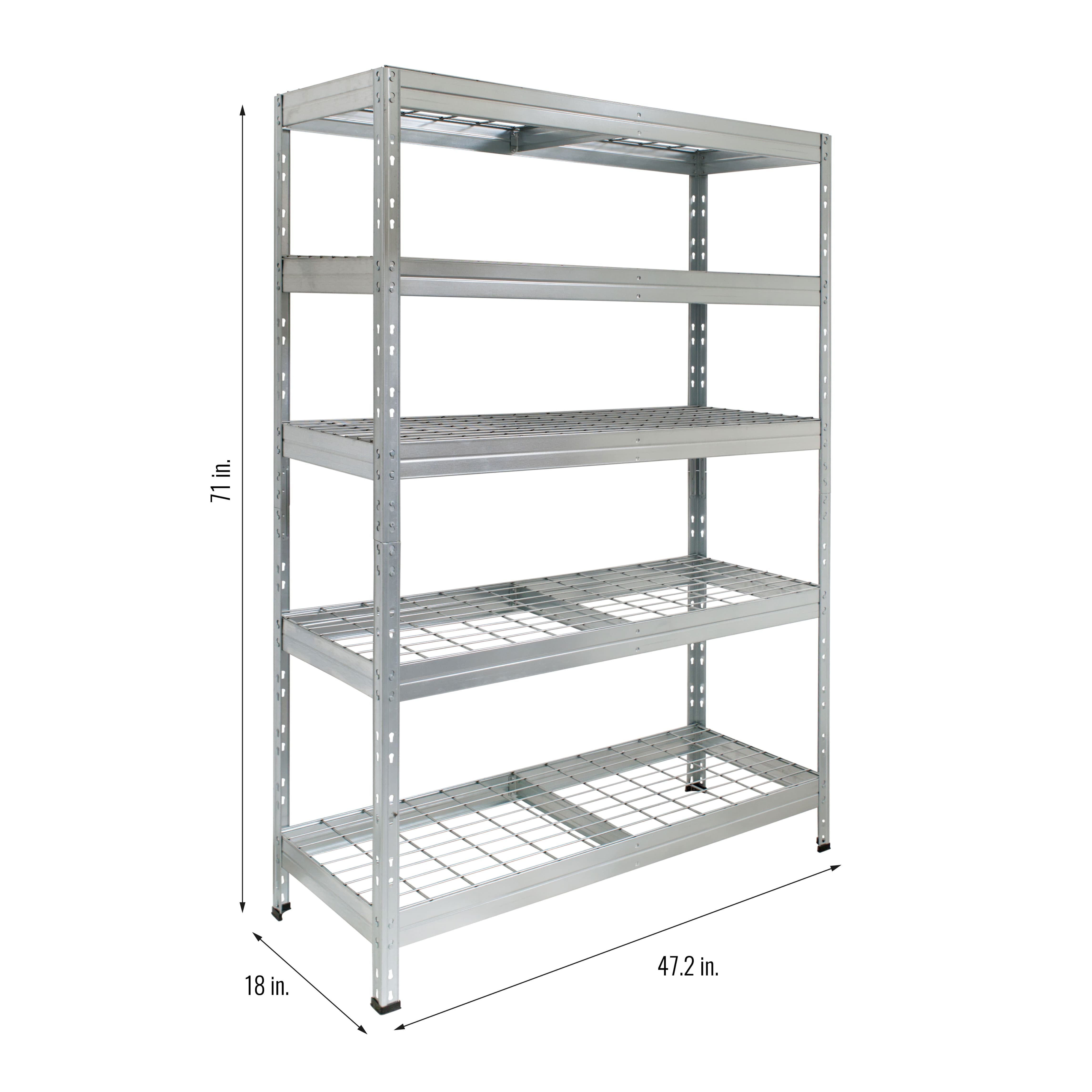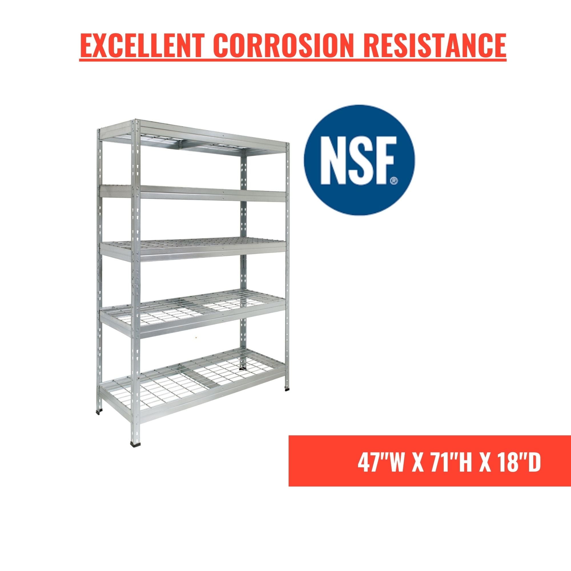 Anti-rust HIGH RESISTANCE Shelves are made out of GALVANIZED steel and electro welded wire mesh Patented upright connector Ideal for outdoor storage (under roof) or any humid places NSF CERTIFIED 500 lbs / 225 kg per shelf loading capacity Assembled size: 47.2´´W x 71 ´´H. x 18″D / 120 cm W x 180 cm H x 45 cm D Versatile: Can be assembled as full size shelving unit or 2 unit shelving system Multiple uses including lawn and garden tools, garage storage, greenhouse storage, autoparts, sports equipment, holiday decorations, pet food, office material and more Fire Safe wire mesh deck Floor protection caps are included Easy assembly between 2 people. Assembled size: 47.2´´W x 18´´D x 71 ´´H. NSF CERTIFIED