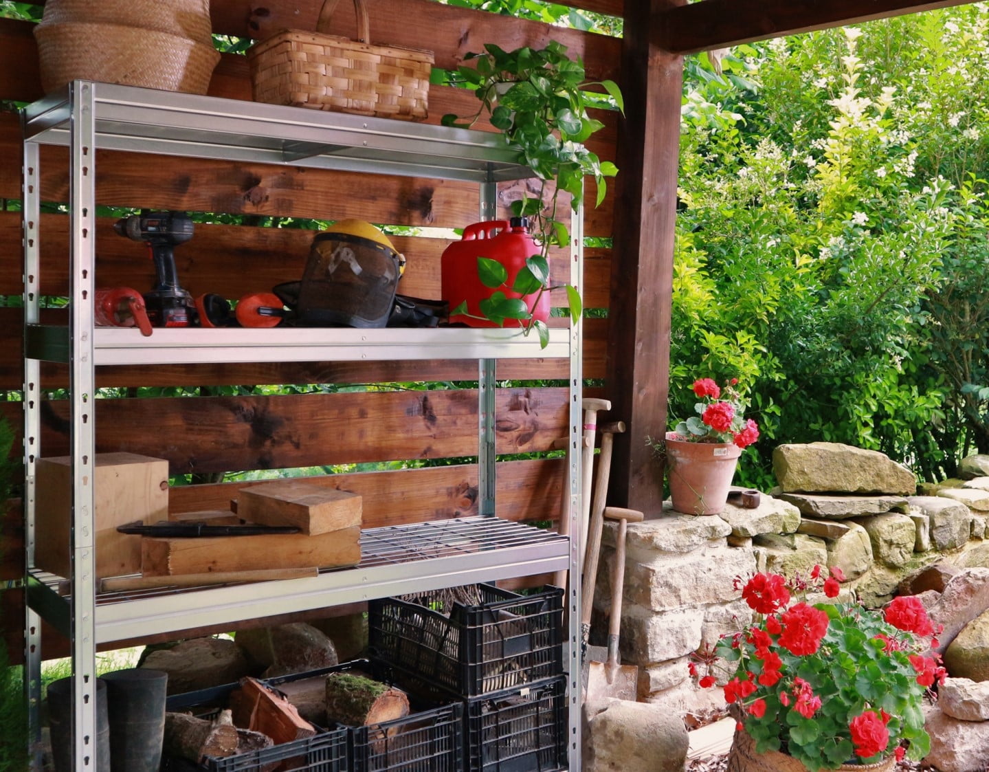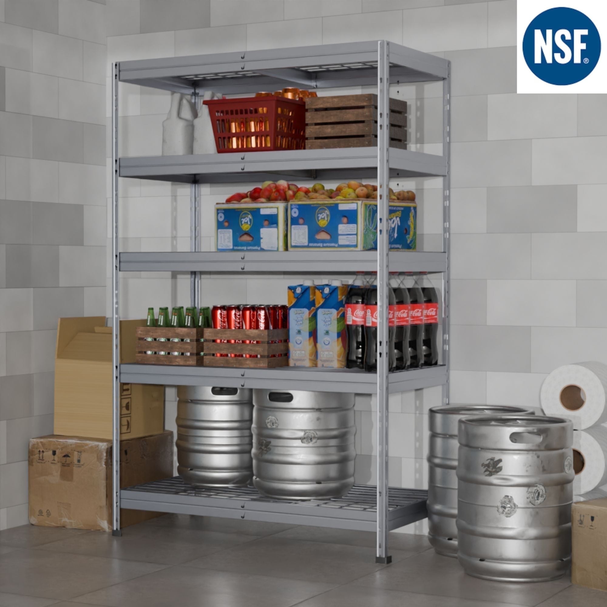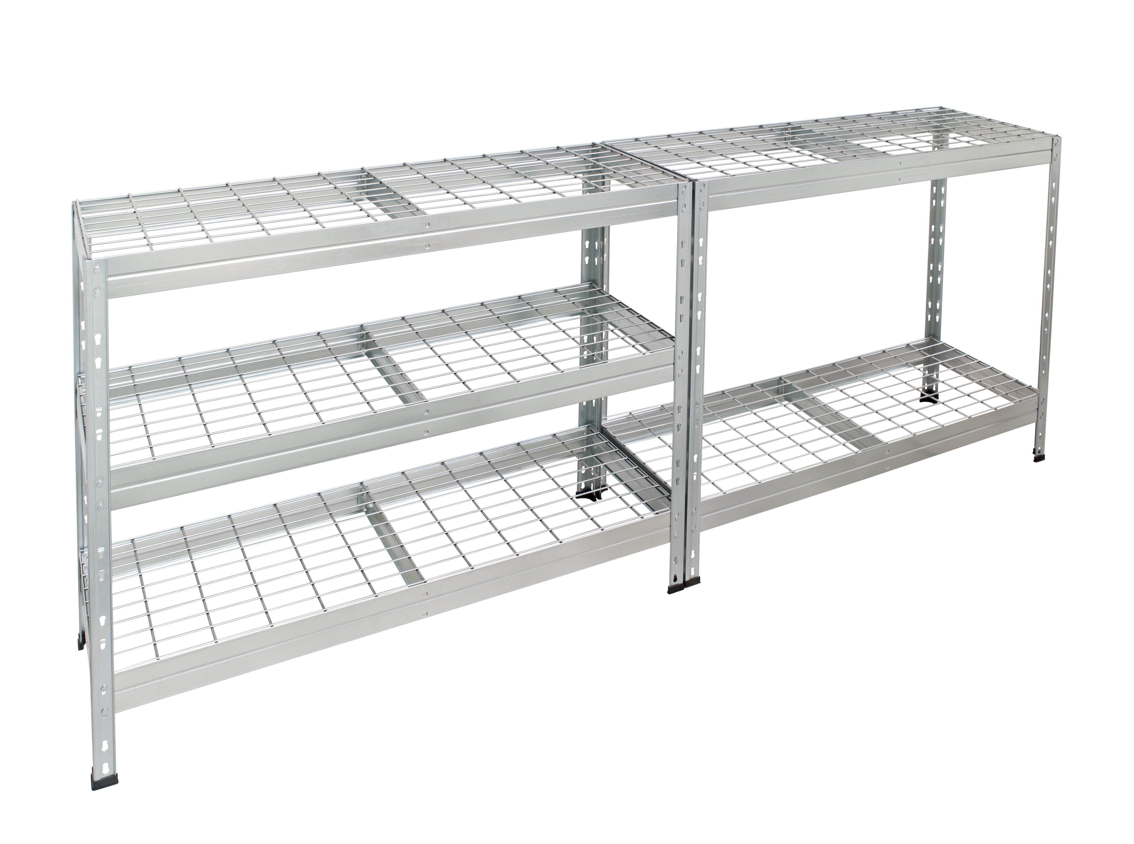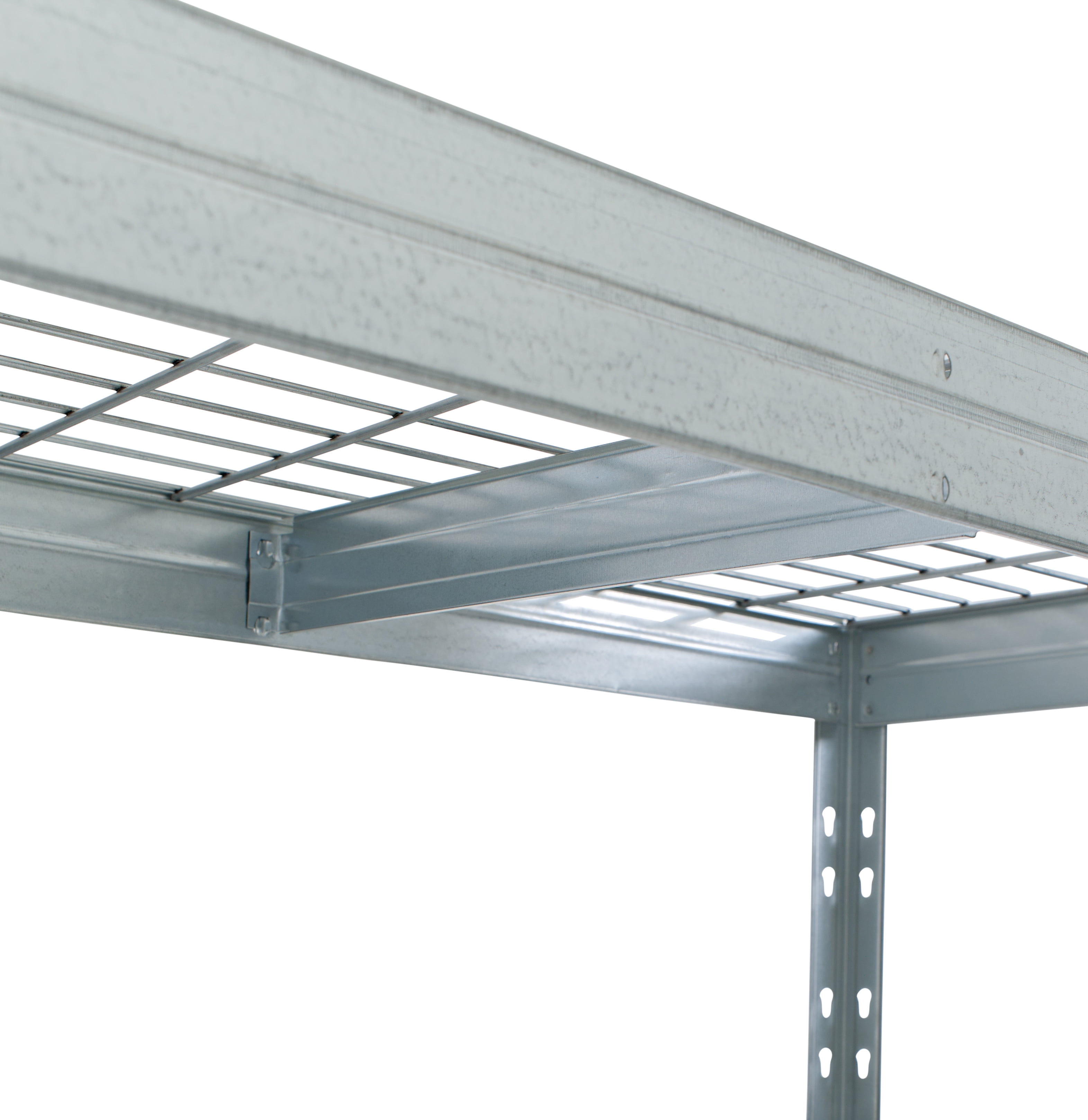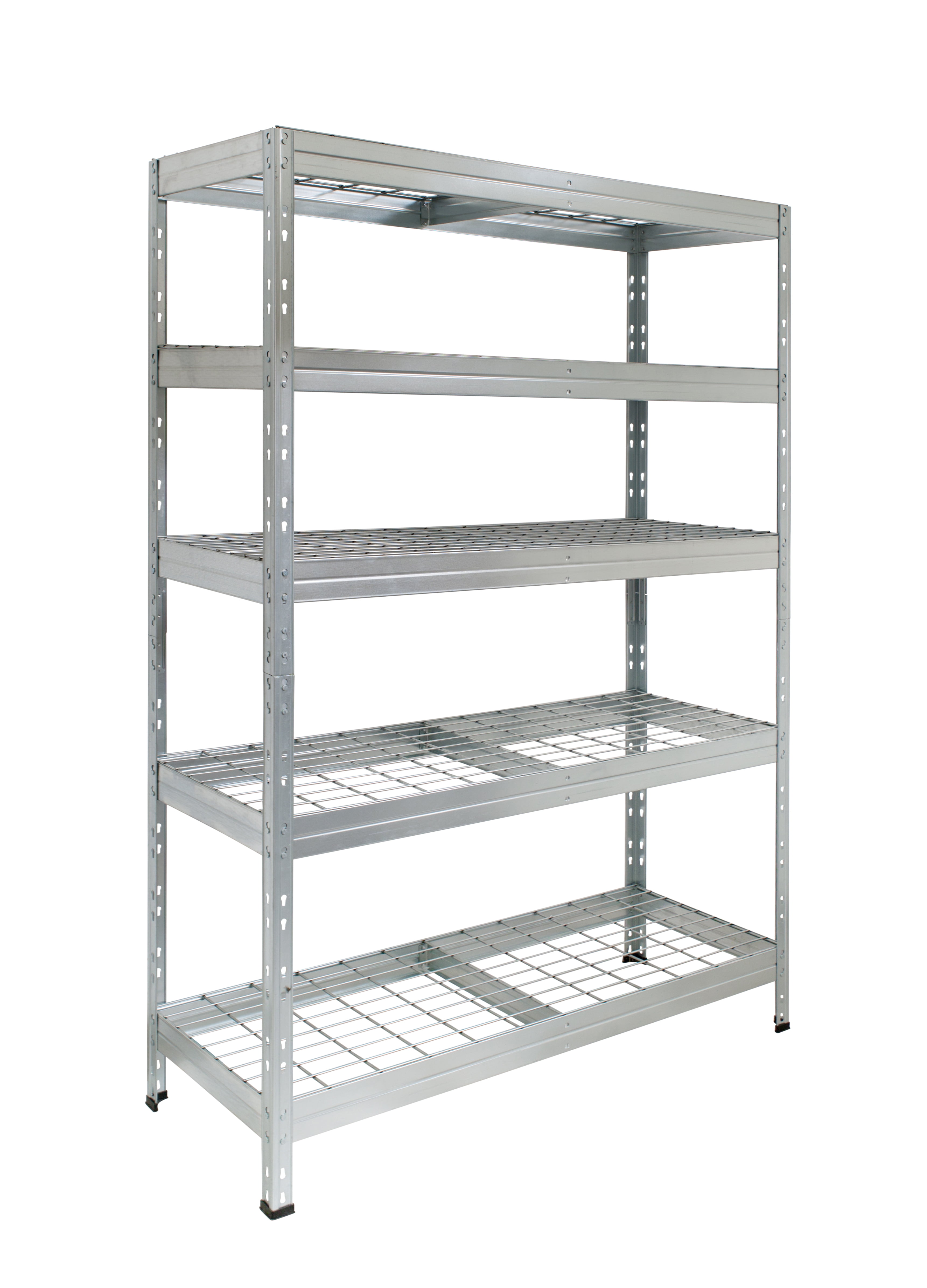 Anti-rust HIGH RESISTANCE Shelves are made out of GALVANIZED steel and electro welded wire mesh Patented upright connector Ideal for outdoor storage (under roof) or any humid places NSF CERTIFIED 500 lbs / 225 kg per shelf loading capacity Assembled size: 47.2´´W x 71 ´´H. x 18″D / 120 cm W x 180 cm H x 45 cm D Versatile: Can be assembled as full size shelving unit or 2 unit shelving system Multiple uses including lawn and garden tools, garage storage, greenhouse storage, autoparts, sports equipment, holiday decorations, pet food, office material and more Fire Safe wire mesh deck Floor protection caps are included Easy assembly between 2 people. Assembled size: 47.2´´W x 18´´D x 71 ´´H. NSF CERTIFIED