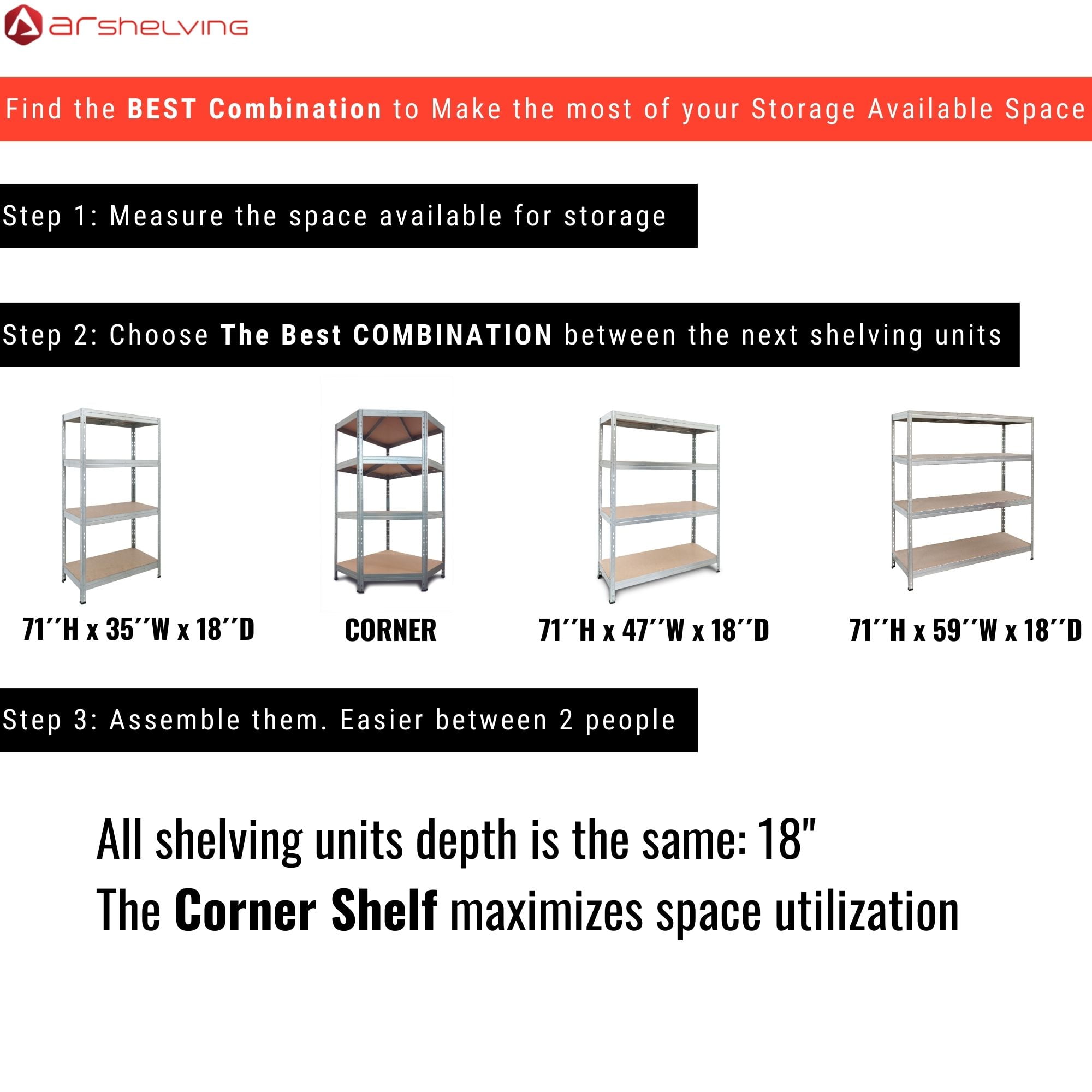 Welcome to the INDUSTRIAL INTERIOR DESIGN ERA! *Fun fact: No matter how they sell it to you or what they tell you, the galvanized finish resists rust much better than the powder coated finish S M A R T People´s shelf collection. No more Spare Storage space thanks to the C O R N E R shelving unit. P O L I S H E D High Density Fiberboard deck that makes it look simply A M A Z I N G. M O D E R N Steel and Wood combination AFFORDABLE M U L T I P L E usages. E N D L E S S combinations. 2,000 Lb / 900 kg total Loading Capacity (Each Shelving unit is sold Separately) Make the most of your available storage space with Ar Shelving S M A R T Metal Utility shelf Series. This is simply the Smartest Storage Way: Combinable shelving units to make the most of your available storage space. NO RUST – NO SCRATCH Galvanized steel. More anti rust resistant than powder coated finish shelving. First Step: Measure your Storage available space. Second Step: Choose the right combination combining the 4 Shelving units. Choose your best combination between these 4 Articles available: (1). 35.4” W x 71” H x 18” D // 90 cm W x 180 cm H x 45 cm D (2). 47.2” W x 71” H x 18” D // 120 cm W x 180 cm H x 45 cm D (3). 59” W x 71” H x 18” D // 150 cm W x 180 cm H x 45 cm D (4). Corner shelving: 35.4” W1 x 35.4″ W2 x 71” H x 18” D // 90 cm W1 x 90 cm W2 x 180 cm H x 45 cm D