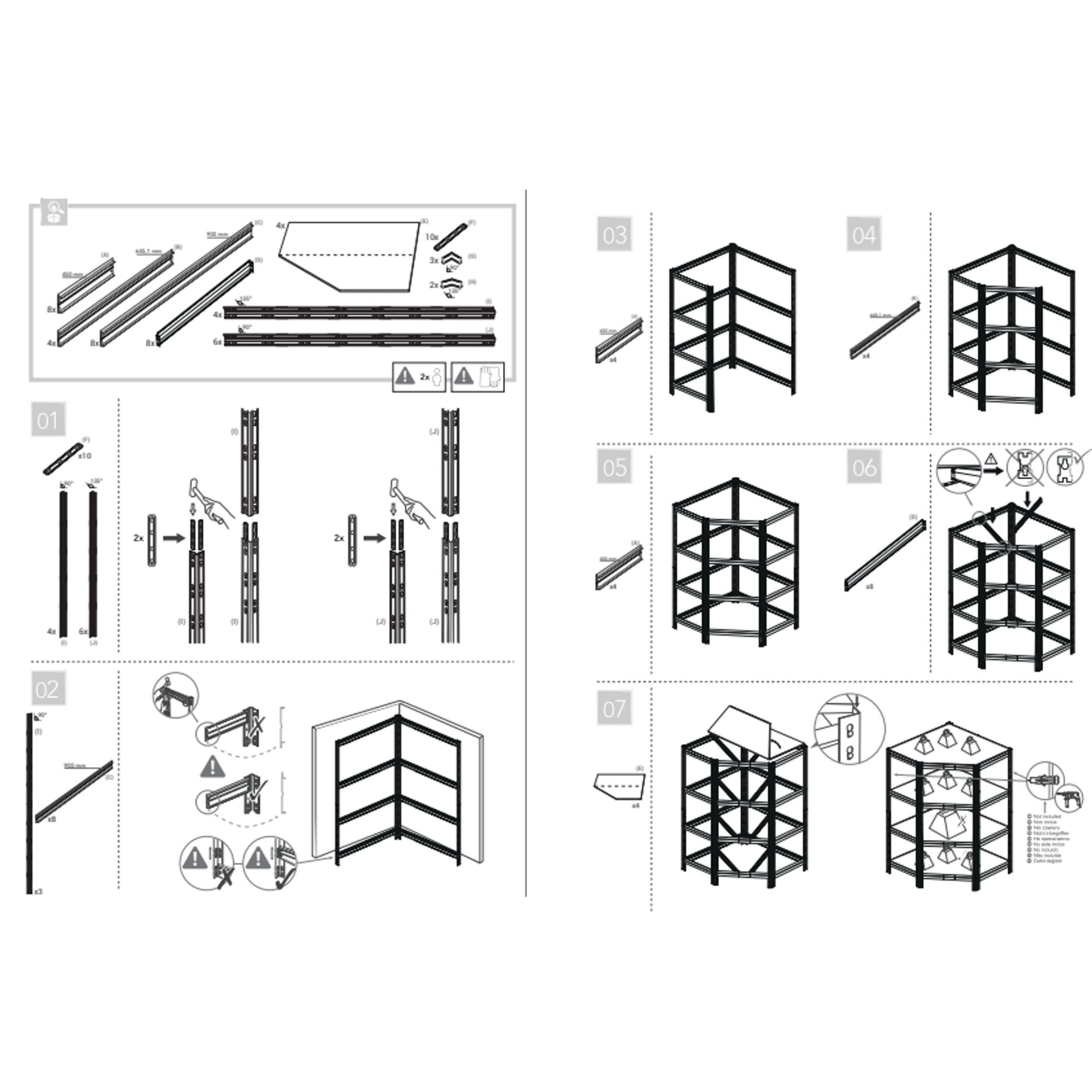 NO RUST – NO SCRATCH Galvanized steel. More anti rust resistant than powder coated finish shelving. Smart Storage. 3 Shelving units and one corner shelf. Combine them to make the most of your available Storage Space. Easy to assemble. Bolts free Assembly Sturdy structure Super Durable Galvanized Steel. Affordable Storage Collection Polished High Density Fiberboard deck that makes it look simply A M A Z I N G. This type of manufactured wood has no porosity so it resists better in humid environments. 500 Lb / 225 kg loading Capacity per shelf. Ideal for boxes not heavier than 40 Lb. 2,000 Lb / 900 kg Total loading capacity Security gloves and a rubber hammer are required for the assembly of the shelving units. Product to be manipulated by adults Easy Assembly between two people Versatile: It can be assembled as a freestanding shelf or 2 workbenches This shelving Collection A D A P T S to your available storage space thanks to its 4 shelving units sizes: 35.4” W x 71” H x 18” D // 90 cm W x 180 cm H x 45 cm D 47.2” W x 71” H x 18” D // 120 cm W x 180 cm H x 45 cm D 59” W x 71” H x 18” D // 150 cm W x 180 cm H x 45 cm D Corner shelving: 35.4” W1 x 35.4″ W2 x 71” H x 18” D // 90 cm W1 x 90 cm W2 x 180 cm H x 45 cm D Security gloves and a rubber mallet are required for the assembly of the shelving units. Product to be manipulated by adults