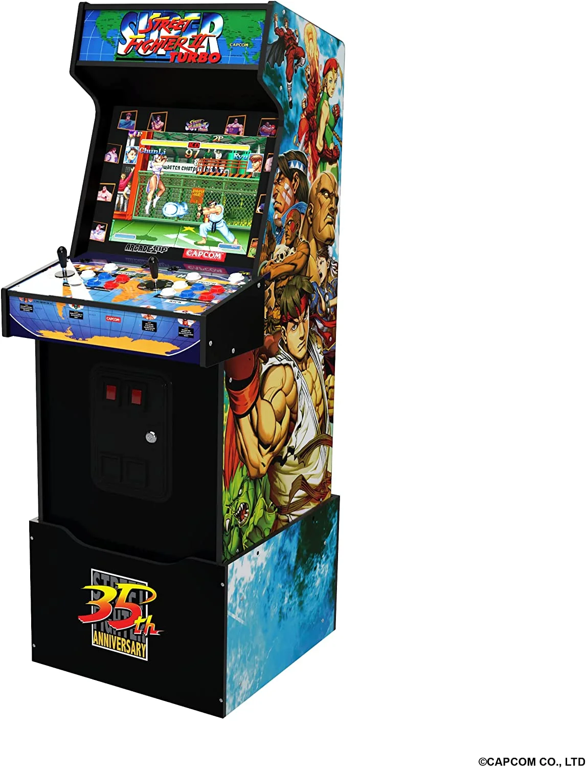 For the first time ever, Arcade1Up introduces remote WiFi LIVE play in a Capcom home arcade game machine! STREET FIGHTER II was the first one-on-one fighting game to feature a variety of characters with their own unique martial arts combinations, propelling it to become an instant arcade phenomenon, and one of the most influential arcade games of all time. Now, over three decades later (and as iconic as ever), Arcade1Up s Capcom Arcade Game Shinku Hadoken Edition features a cabinet aesthetic inspired by the mystical Dhalsim s fiery attack and this Arcade1Up game machine is THE way to bring that fierce fightin 90s style home! Easily assembled, Arcade1Up game machines provide authentic (and yes, way nosta ic) arcade experiences for your family game room, fan cave, or a welcome distraction in the office. They play great, look great, and are instant conversation pieces. Let s start with the marquee game, STREET FIGHTER II TURBO: HYPER FIGHTING. An unreal, amped-up iteration of the title that absolutely revolutionized the fighting game genre! From Ryu to Ken to Chun-Li and all of your other favorite combatants, perfect your combos, and pile up those victories. Also included are STREET FIGHTER II: CHAMPION EDITION and STREET FIGHTER II TURBO. All at your fingertips, all just like how you remember them! And that s just the start of the 14-game line-up packed inside this gorgeous cabinet, that includes a matching riser and light-up marquee. Yep 14 titles! KING OF DRAGONS, STRIDER, PROGEAR, BATTLE CIRCUIT, SUPER PUZZLE FIGHTER, SATURDAY NIGHT SLAM MASTERS, CAPCOM SPORTS CLUB, FINAL FIGHT, GIGA WING, CAPTAIN COMMANDO, ARMORED WARRIORS, are also ALL included. Switch it up to any included game at will, with the easy-to-navigate on-screen menus. Oh, and in addition to the WiFi LIVE play, see how your high scores measure up with WiFi leaderboards! Iconic arcade games. Pop culture imagery has stood the test of time. The nosta ia that tr