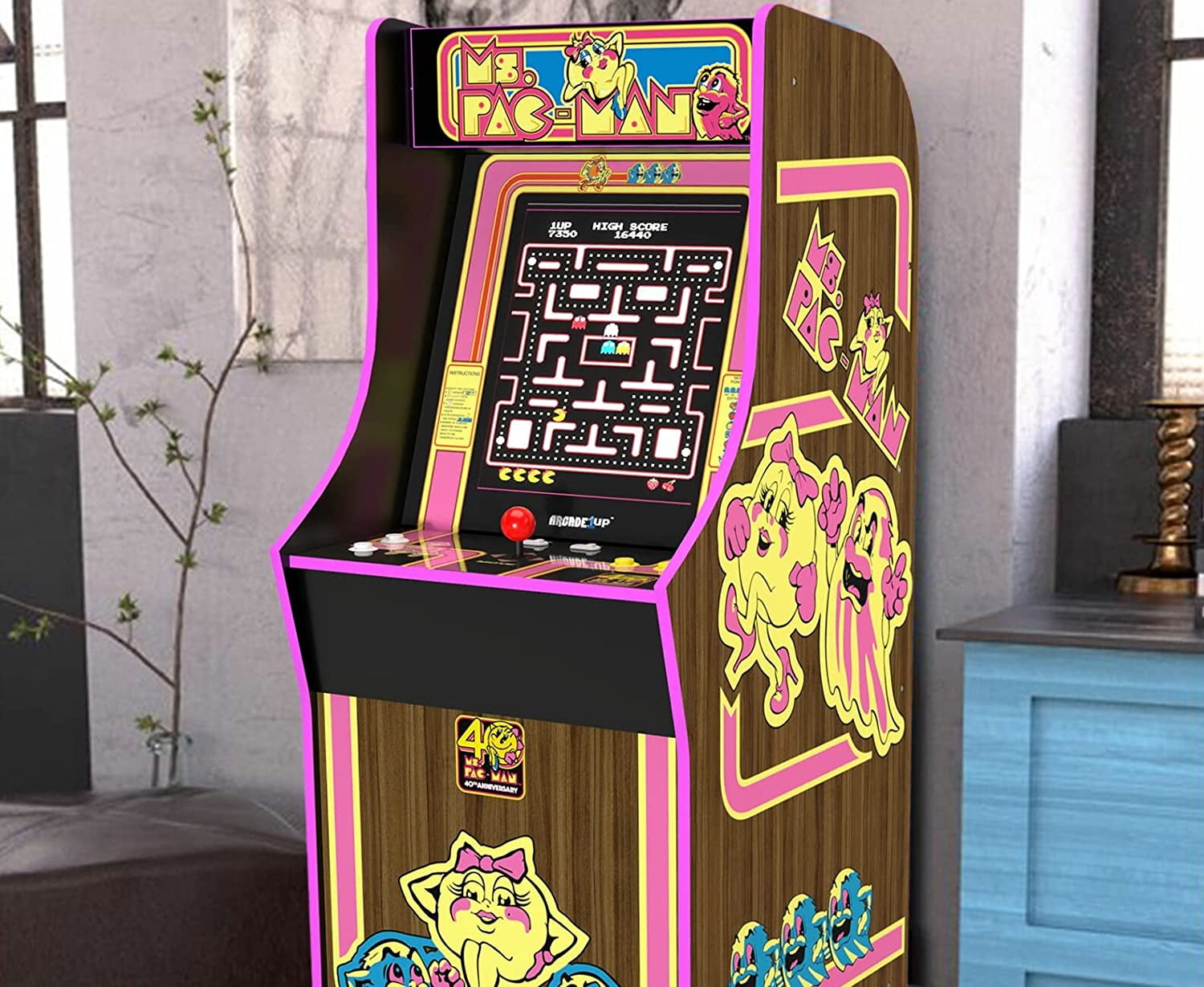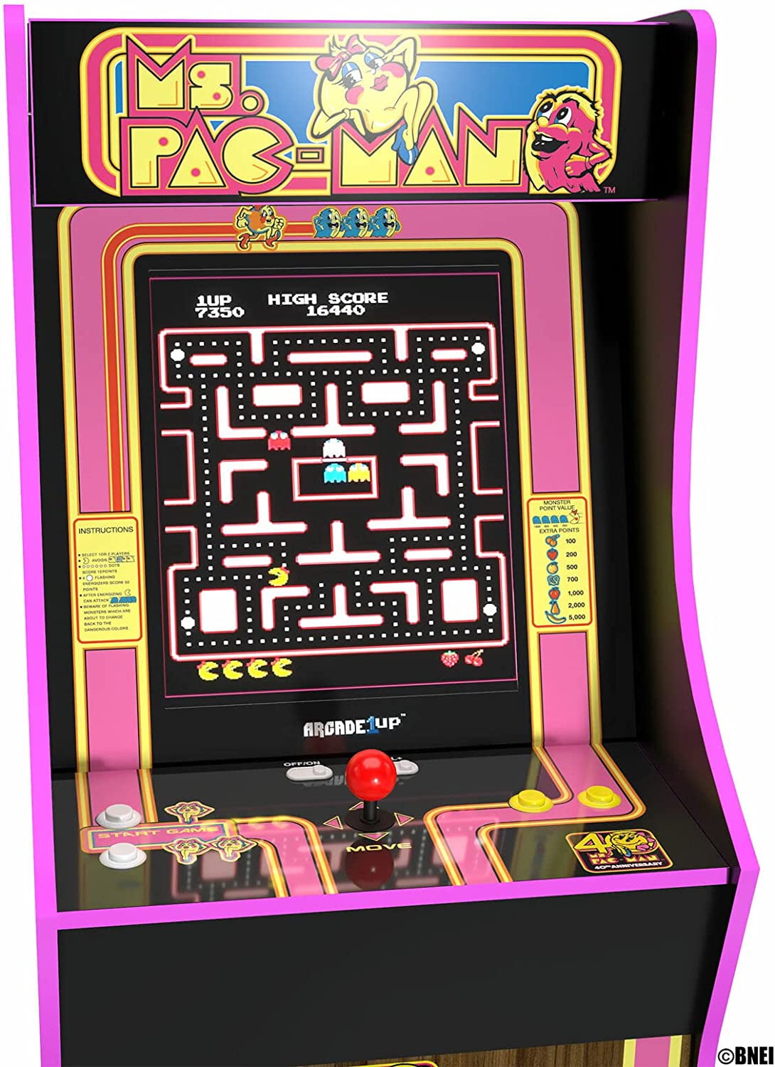 Classic arcade machine featuring 10 games for endless gaming fun on 1 machine Features classic Ms. Pac Man graphics with an added touch of 40th-anniversary illustrations Real-feel arcade controls and on-screen game selection menu add to game playing fun Coinless operation provides unlimited play for all the included 10 games Dimensions: 45.8 H x 22.75 H x 19 W