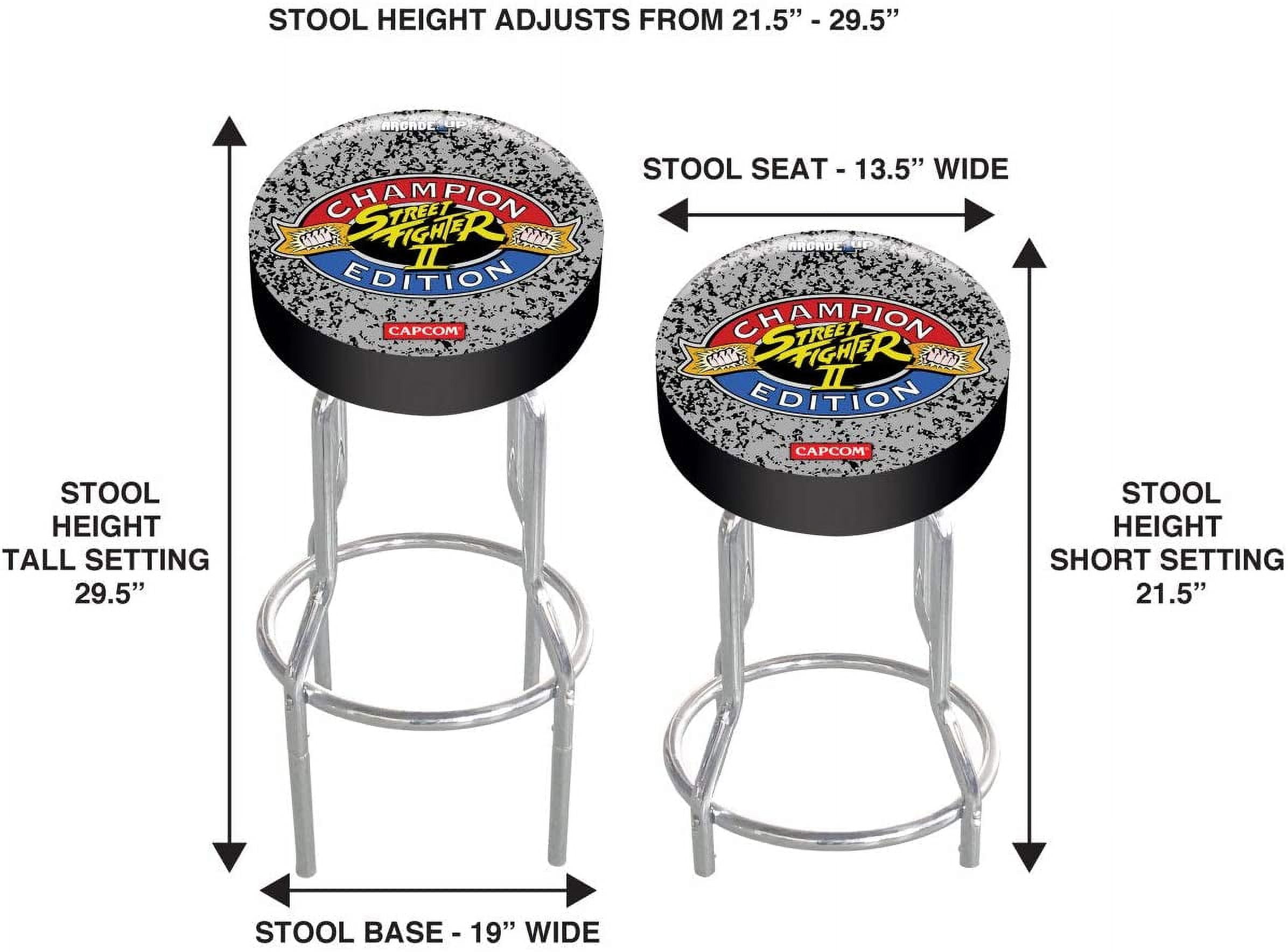- Adjustable stool can be set to 2 different heights at either 21.5″ For the Arcade1Up cabinet or 29.5″ With leg extenders, the perfect height for cabinet with riser.