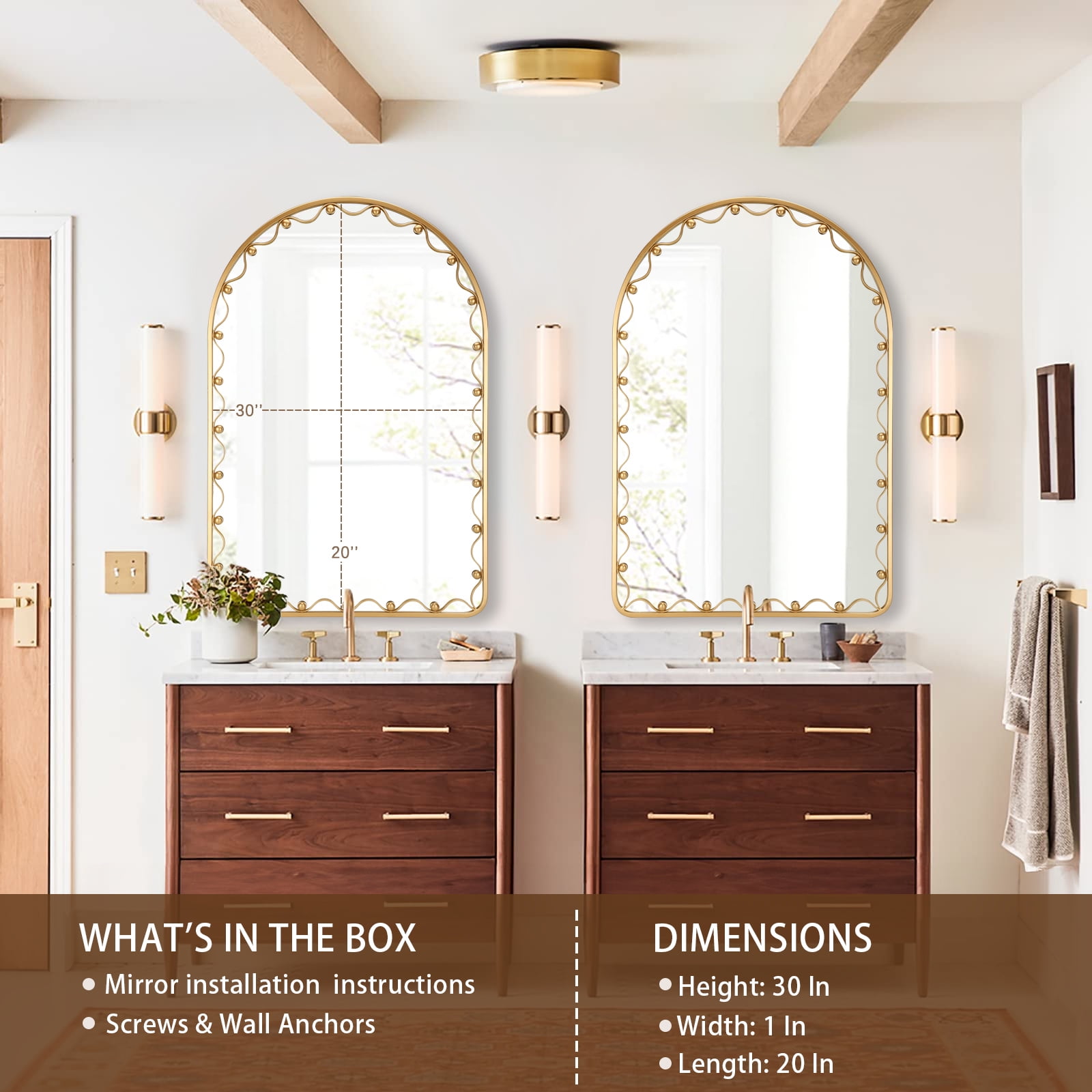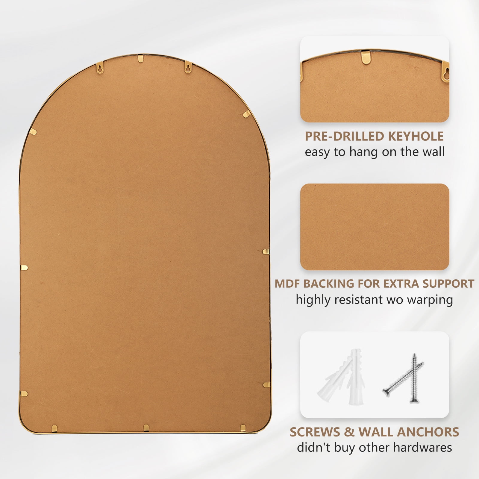 EASY INSTALLATION – The arched wall mirror can be installed in minutes. The first step is to choose a suitable location and drive the supplied nails into the wall. The second step is to hang the arched gold mirror into the dovetail hook.(Heavy and Large Mirror, two people is recommended during installation.)