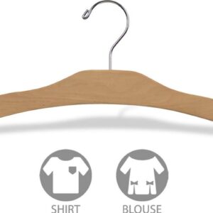 Arched Wood Top Hanger, Box of 25 Space Saving 17 Inch Flat Wooden Hangers w/ Natural Finish and Chrome Swivel Hook and Notches for Shirt Jacket or Dress by International Hanger
