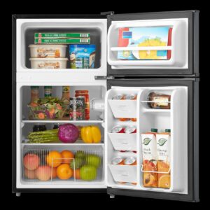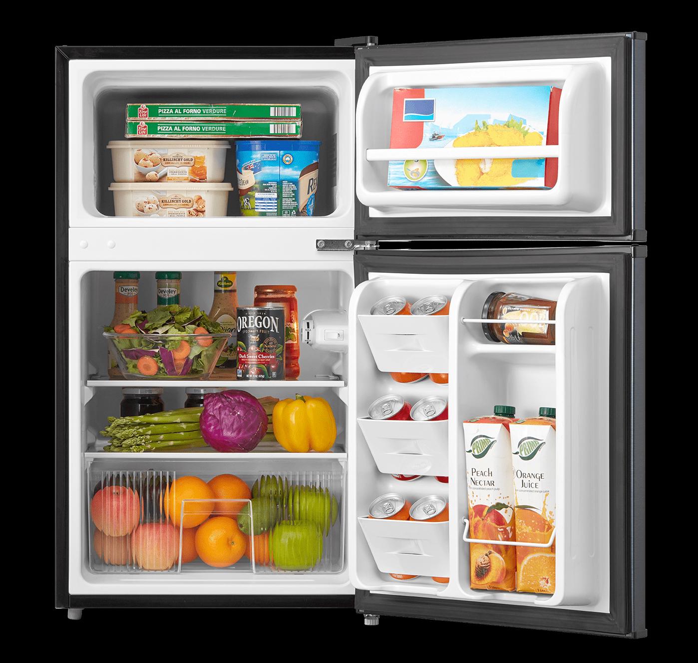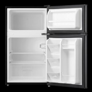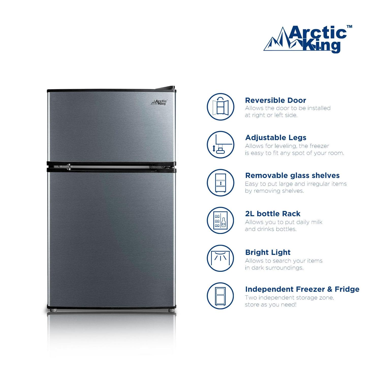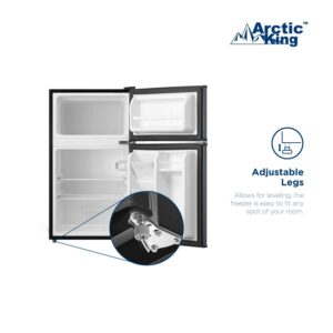 The Arctic King 3.2 cu ft Two-Door Compact Refrigerator is an excellent way to keep your food and drinks cold in any sized room. The separate freezer compartment gives you plenty of space to store your frozen dinners, ice cream and more. The can dispenser and two-liter bottle rack free up shelf space and make your favorite drinks easily accessible. The stylish stainless steel look will suit all styles of decor and the interior light makes it easy to find your favorite treats. Use the mini fridge in your den, garage, office or dorm room, and it can easily fit in a tight corner or other out-of-the way place. Arctic King 3.2 cu ft 2-Door Compact Refrigerator not only keeps your favorite food perfectly fresh for longer, but its manual defrost setting allows you to clean whenever you want for optimal cooling and food preservation. Easily set the internal temperature according to your needs, and simply adjust the leg height as this compact cooler fits perfectly in any kitchen.