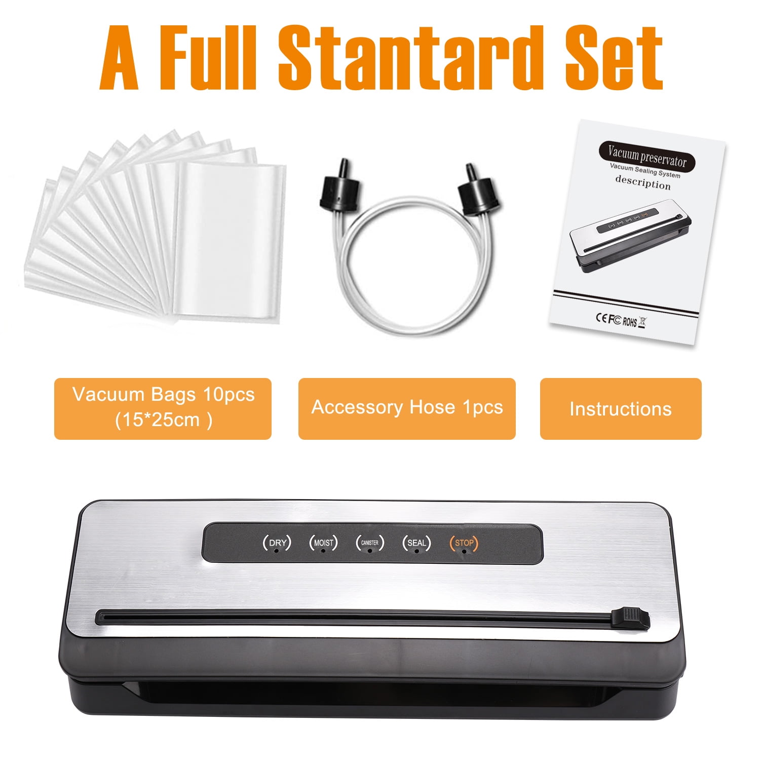 How to preserve the freshness and nutrition of ingredients has become a major problem in our daily life. Don’t worry, we have brought you a brand new vacuum sealing machine that can make your life easier and more convenient. This vacuum sealing machine adopts advanced vacuum technology, which can quickly seal your ingredients, snacks, dry goods, etc., to ensure their freshness and taste. The food protection vacuum sealing machine with cutting machine, you can save the food protection vacuum sealing bag and space, and cut the food protection vacuum sealing bag at will according to the size of the ingredients. One-click operation, simple and easy to use, makes your sealing process easier. ❖ Multifunctional: Wet and Dry Modes – Maximize the Freshness of Different Types of Food Vacuum Sealing – One Button Operation External VAC – for Jars, Jars and Wine Preservation Built-in Cutter – Easily Customize Bag Size Sealed – Quick Sealed Only Stop – Cancel the Current Process at Any Time Style: Save Space,Food Saver Vacuum Sealer Machine with Cutter Extra Gift: 50 Foodsaver Vacuum Sealer Bags Operation Mode: Automatic Color: Silver Sealing Size: 12.59in Product Size:15.1×5.1×2.8in Weight: 1.09kg Accessories: Vacuum Sealer x1, Vacuum Hose x1, Vacuum Sealing Bag x50,User Manual x 1 ● If you have any questions during installation or use, please contact us by email, we will reply to you within 24 hours!
