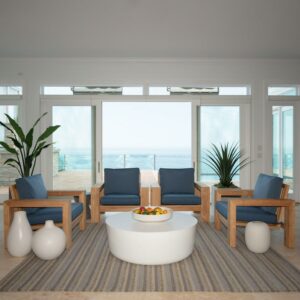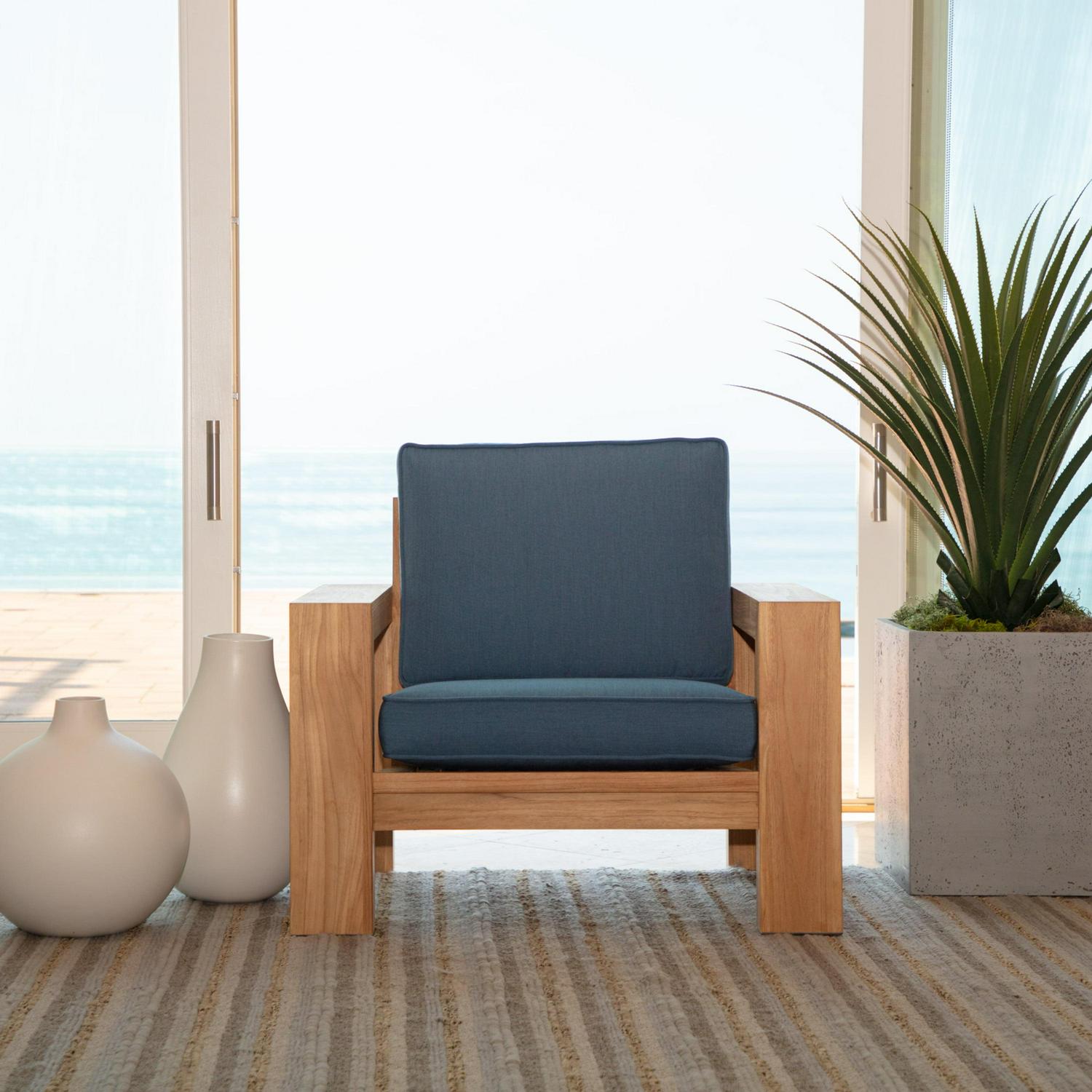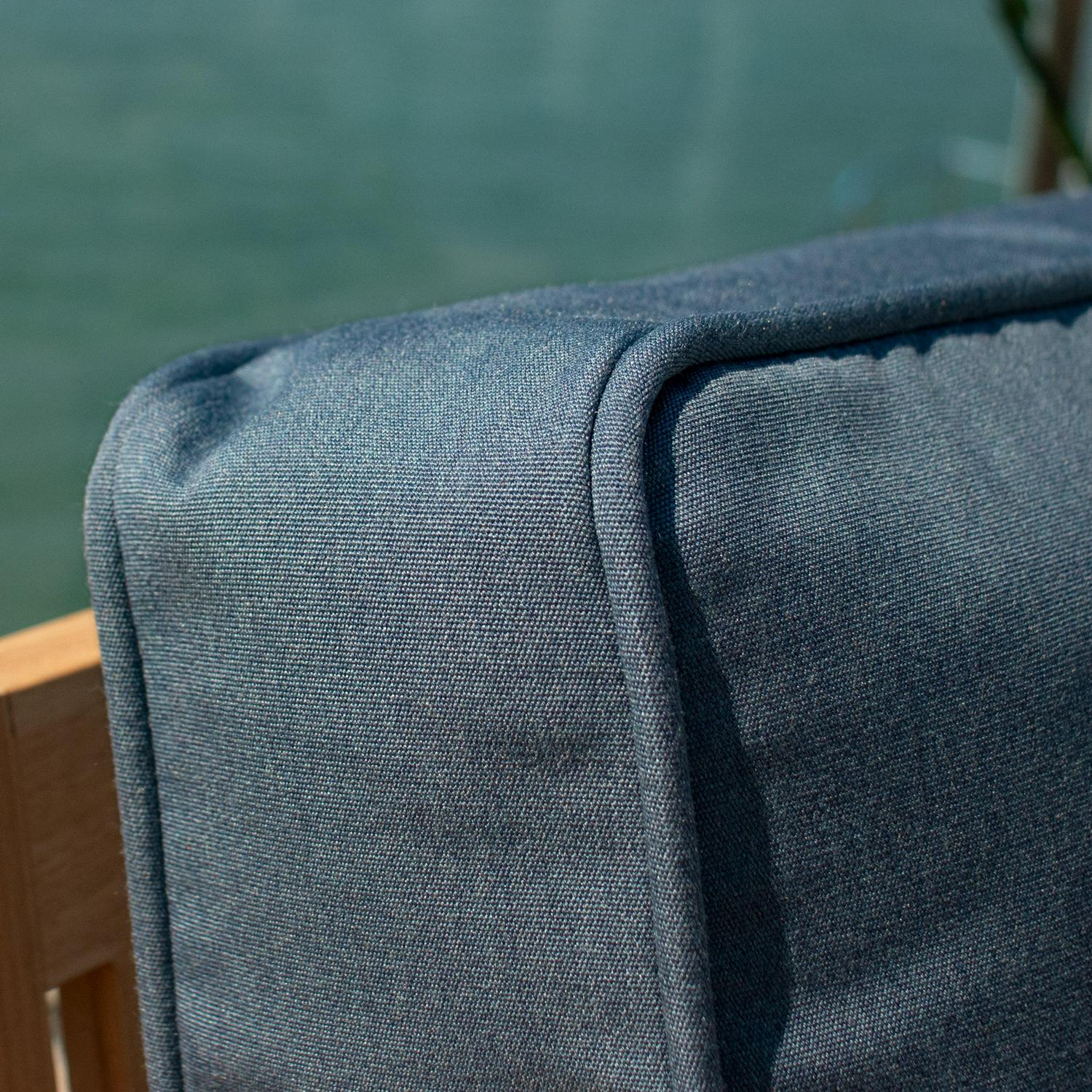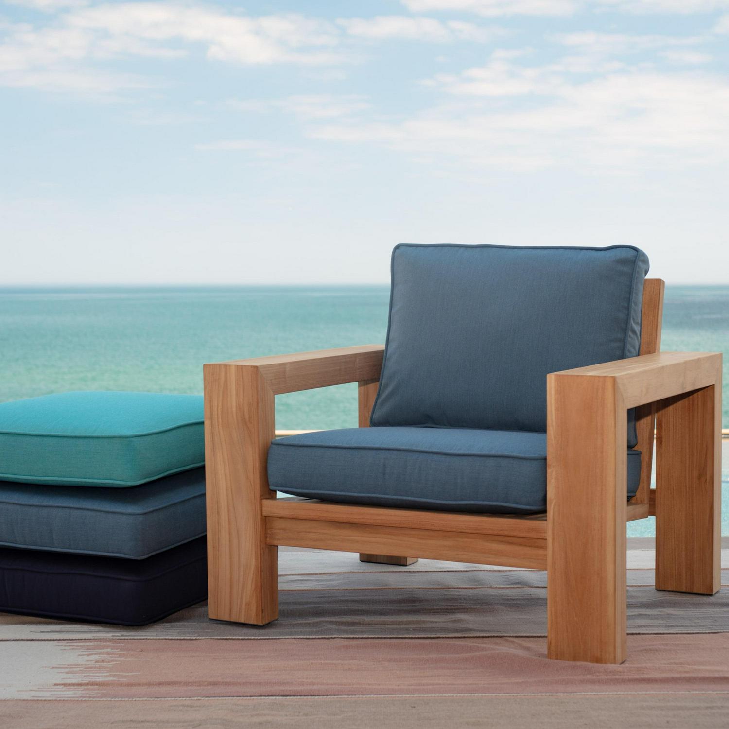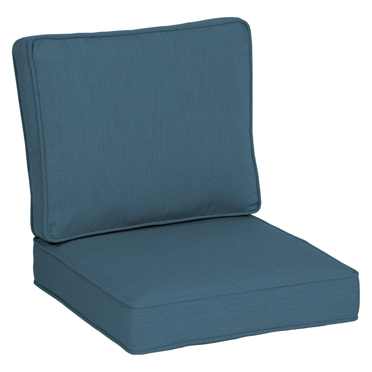 Arden Selections(R) Oasis is the exquisite combination of our top of the line EverTru(R) acrylic fabric paired with our highest quality poly-wrapped foam fill to create an ultra-premium outdoor cushion. This chambray blue outdoor firm back deep seat set has a 24-inch long x 24-inch wide x 4. 5-inch thick bottom and a 20-inch long x 24-inch wide x 4. 5-inch thick back. The 100% EverTru(R) canvas-weave acrylic fabric is tightly woven, providing a tough but light-weight and amazingly soft cushion cover. The acrylic’s extended UV protection means your fabric will continue looking brighter longer as you enjoy your hours outdoors and comes with a 5-year limited fabric warranty. The stain and water protection from our proprietary EverBloc treatment ensures optimum outdoor use. Easily spot clean with soap and water, or a mixture of bleach and water for harsh stains. Oasis poly-wrapped foam cushions are a luxurious medley of foam, wrapped in a soft polyester batting to create a durable, long-lasting, firm outdoor cushion with a soft-to-the-touch indoor feel. The Plush Back Oasis Deep Seat offers an even softer alternative cushion back for those who like to sink into their cushion while still providing the firm support and comfort of the traditional Oasis cushion bottom. All of our Oasis cushions have a classic finish of the double welt and velcro straps to hold your outdoor patio cushion in place. Even though our EverTru(R) offers best-in-class water and UV resistance, we still recommend you bring in or cover your cushions when not in use to keep them looking and feeling great for years.