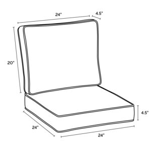 – Cushion Dimensions: 24-inch long x 24-inch wide x 4. 5-inch thick bottom and a 20-inch long x 24-inch wide x 4. 5-inch thick back.