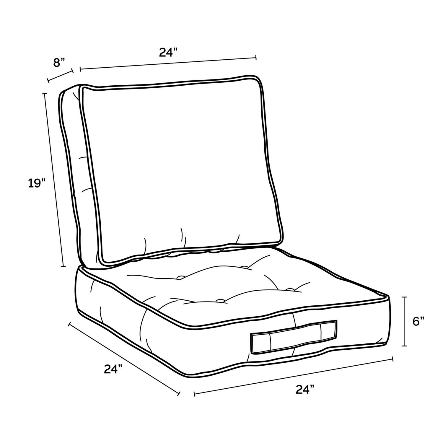 - Cushion Dimensions: Back: 19 in H x 24 in W x 8 in T, Bottom: 24 in L x 24 in W x 6 in T