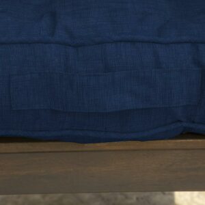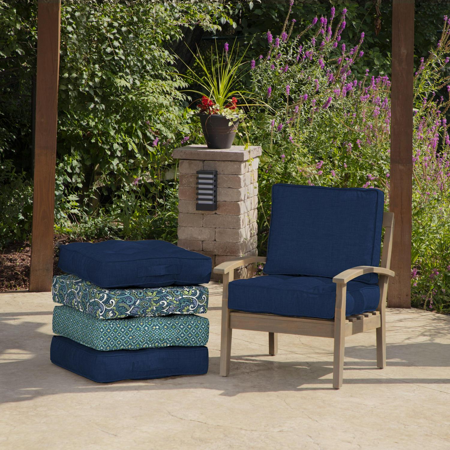 The Arden Selections Plush BlowFill Collection pairs soft polyfiber fill with long-lasting outdoor polyester fabric to create an ultra-comfortable outdoor patio cushion. This Sapphire Blue Leala outdoor deep seat cushion set has the following dimensions: Back: 19 in H x 24 in W x 8 in T, Bottom: 24 in L x 24 in W x 6 in T. The 100% printed polyester outdoor fabric features high UV pigments to protect from ultraviolet rays and resist fading, so your outdoor patio cushion looks vibrant for longer. Water protection helps your patio cushion withstand continued outdoor use, while easy cleaning with just soap and water ensures upkeep is low maintenance. This 2-piece outdoor cushion set with carrying handle and 4 decorative buttons is designed to fit most standard size deep seat furniture. Inside this patio cushion is 100% polyfiber blowfill to help it retain shape and provide long-lasting comfort during outdoor use. Made from 100% recycled plastic bottles, the polyfiber fill provides an environmentally friendly and durable option for your backyard patio. Although this outdoor patio cushion is both water and UV-resistant, we recommend bringing it indoors when it rains or when not in use to preserve its lifespan and keep it looking beautiful.