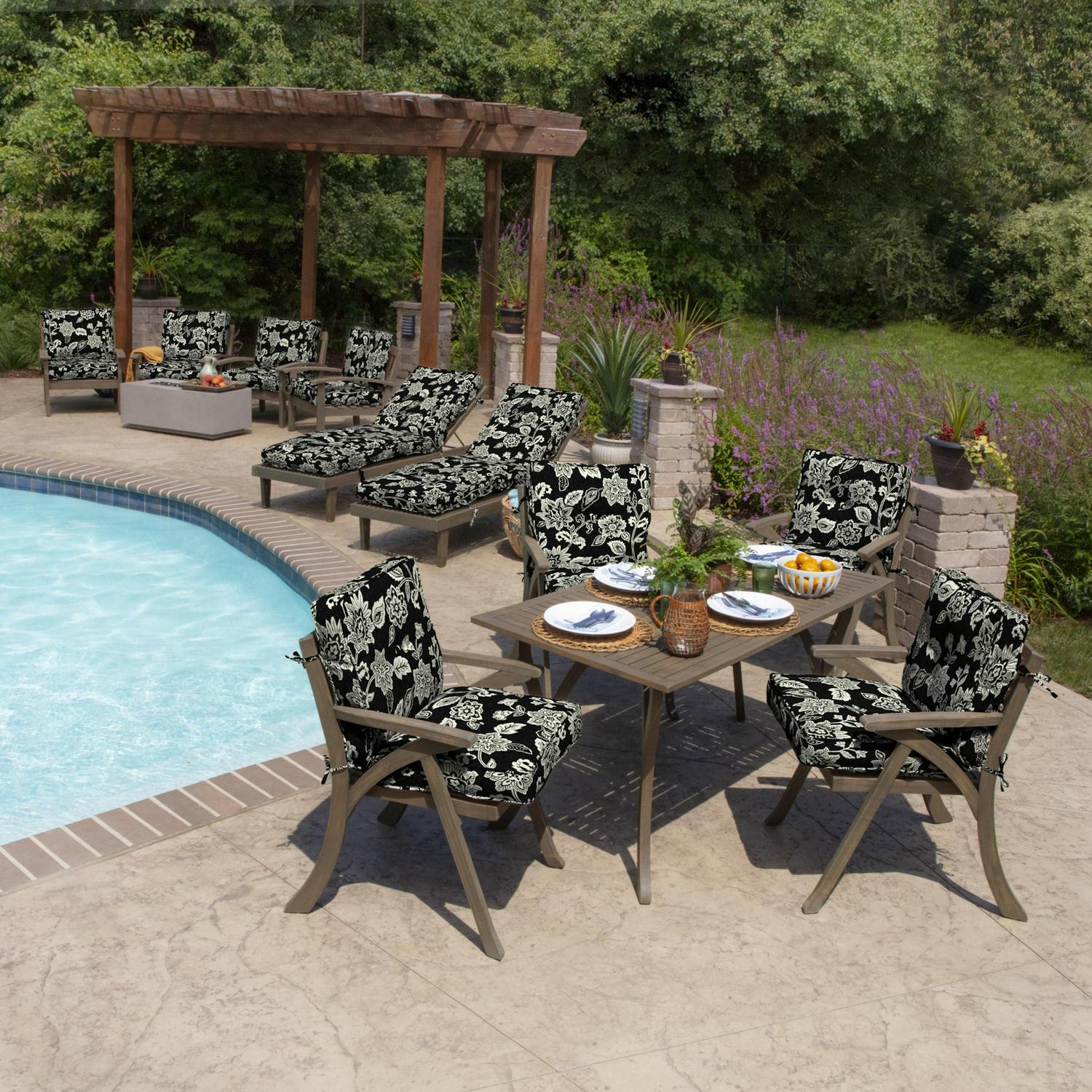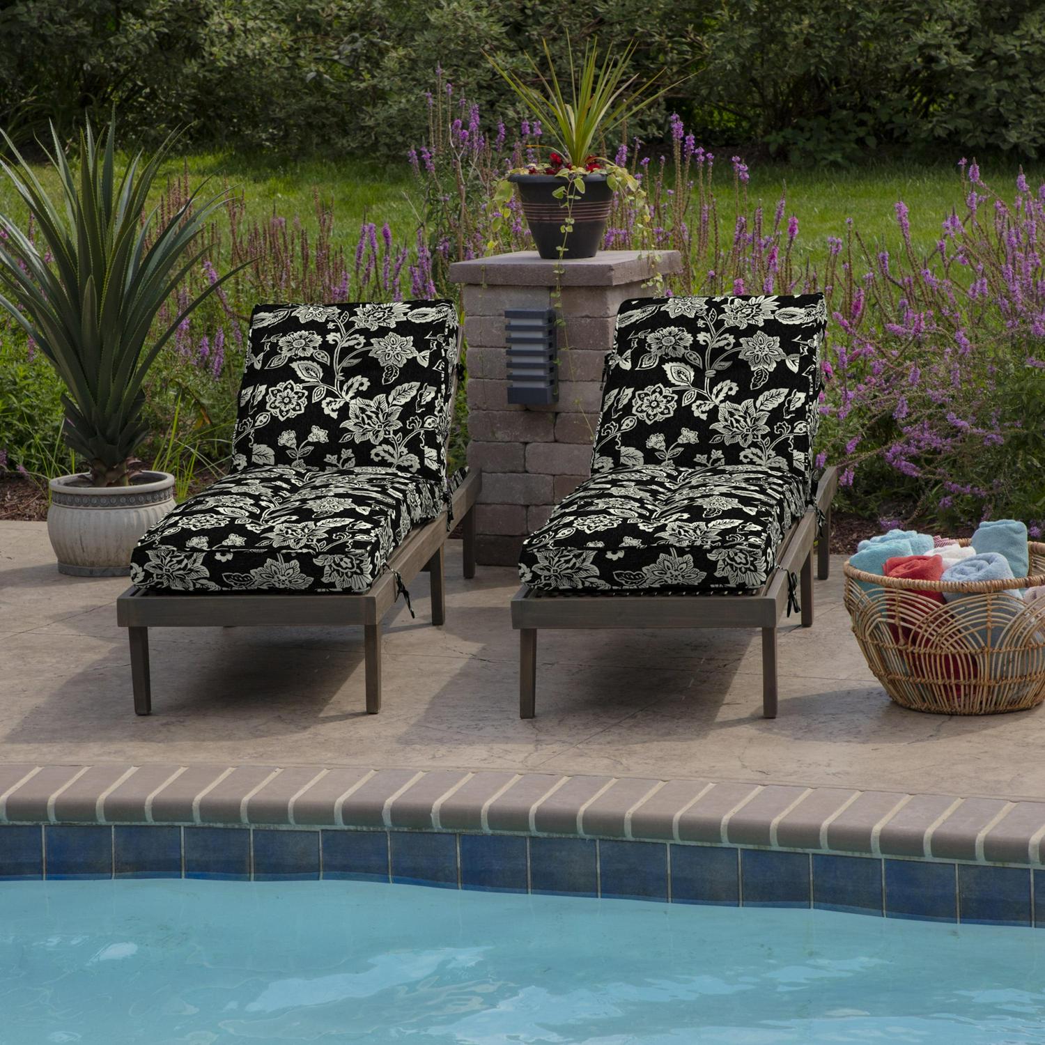 The Arden Selections Plush Blow Fill Collection pairs soft polypier fill with long-lasting outdoor polyester fabric to create an ultra-comfortable outdoor chaise cushion. This Ashland Black Jacobean outdoor chaise lounge cushion has the following dimensions: Back: 30″ H x 22″ W x 6. 5″ T, Seat: 46″ L x 22″ W x 6. 5″ T. The 100% printed polyester outdoor fabric features high UV pigments to protect from ultraviolet rays and resist fading, so your outdoor chaise cushion looks vibrant for longer. Water protection helps your chaise patio cushion withstand continued outdoor use, while easy cleaning with just soap and water ensures upkeep is low maintenance. Six sets of ties secure the outdoor chaise cushion firmly place, while 4 buttons add a decorative touch. Side this outdoor chaise cushion is 100% polypier blow fill to help it retain shape and provide long-lasting comfort during outdoor use. Made from 100% recycled plastic bottles, the polypier fill provides an environmentally friendly and durable option for your backyard patio. Although this chaise patio cushion is both water and UV-resistant.