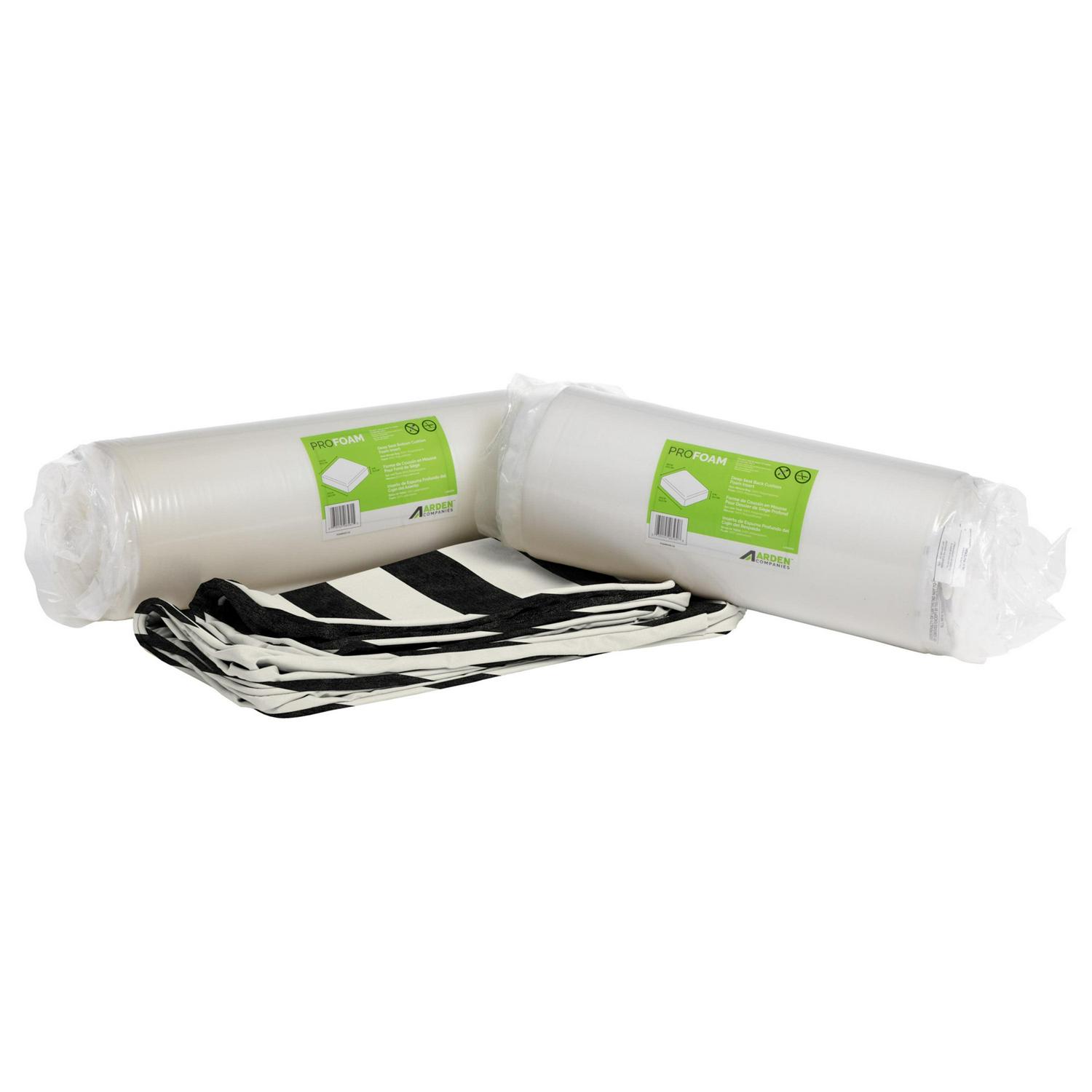 This Arden Selections ProFoam Outdoor Deep Seat Cushion Set is made with the same high-performance, long-lasting, durable foam that came with your outdoor furniture set. These firm, yet comfortable outdoor foam patio cushions have a sleek and modern look, adding clean lines to refresh your outdoor furniture. The two pieces of foam come in compressed rolls to reduce shipping waste and easily slip into the provided acrylic cushion covers. This deep seat set comes with an interchangeable back and bottom cushion that give two very different, yet distinct and stylish looks. With the clean finish of the double welt, this 100% solution dyed acrylic cushion cover features weather and UV resistant EverTru Acrylic fabric, which resists fading and repels water and stains. The extended UV protection means your fabric will continue looking brighter longer as you enjoy your hours outdoors and comes with a 5-year limited fabric warranty. The proprietary EverBloc stain and water protection ensure optimum outdoor functionality, with easy spot cleaning with soap and water, or a mixture of bleach and water for harsh stains. Arden Selections ProFoam comes in a variety of colors and styles, all with easy to use extra long zippers that make changing your cushion a breeze. Look for our other Arden Selections ProFoam cushion styles to fit all your outdoor furniture needs.