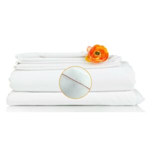 Bulk pack of 6 FLAT bed sheets. White, 200 thread count, FULL bed size, and the material is made of a soft blend of 55% cotton and 45% polyester. Our flat bed sheets are soft, plush and quick wicking and are perfect for use in hotels, spas, vacation rentals, therapy clinics, camps, air beds, bed and breakfasts and home bedrooms. They are also color coded for industrial use. PROTECTION: Our soft flat bed sheets are non-piling, wrinkle-resistant and have hemmed edges for added strength and durability. Use our soft bedding as an inner layer to protect your mattress from stains and dirt and maintain coverage from corner to corner.