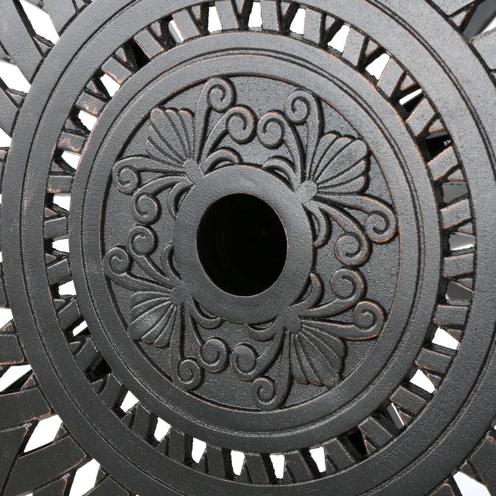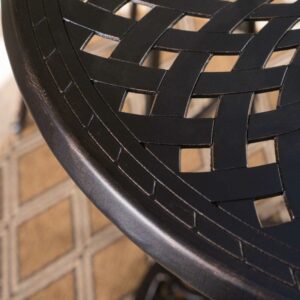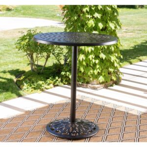 Update your patio with the Arlana Outdoor Cast Aluminum Bar Table so that you and your guests have a handy place to set drinks when standing. It’s made of cast aluminum, making it lightweight and sturdy, with a copper finish and filigree design that combine to enhance its beauty. This round table can seat up to four people and includes an umbrella hole for versatility. Requires some simple assembly.