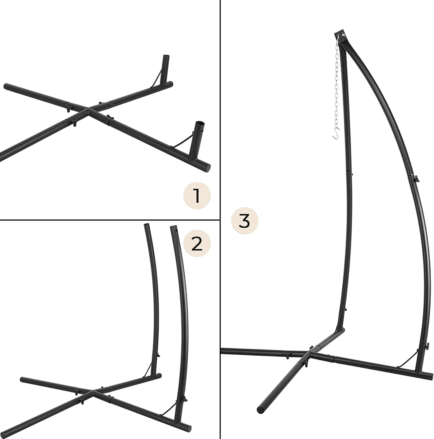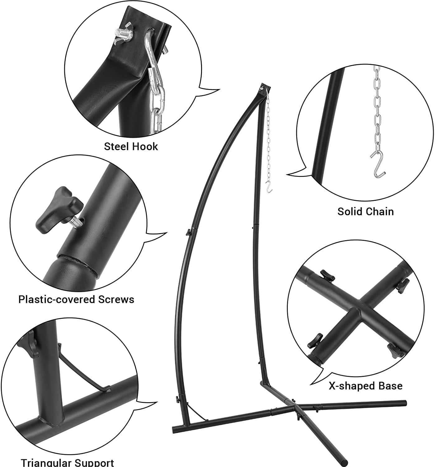 Arlopu Steel Hammock Chair Stands, X-base Stand for Hanging Hammock Air Porch Swing Chair Indoor, for Indoor Outdoor Use, 330 lbs Arlopu hammock chair stand is a great choice for you to enjoy your tree tent or loungers. It fits great into any outdoor setting or you can set it up indoors. Arlopu steel hanging hammock stand does not take up much room and X-base design makes it sturdy to hold most hammock, chair, loungers. It is constructed of powder coated steel that will make it withstand most weather conditions. Instruction book included, easy to assemble. hammock chair stands are very suitable as gifts for dear grandchildren, using with all kinds of hanging chairs and enjoying happy leisure time. Stand only, all kinds of chairs showing in this listing are not included.