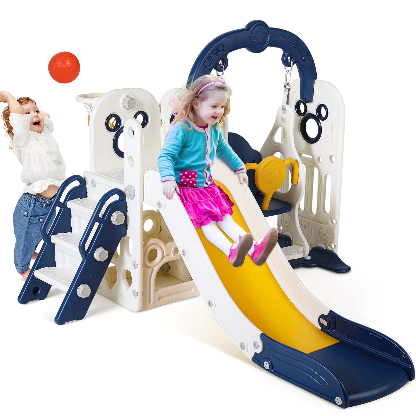 5 IN 1 ACTIVITY CENTER – The adorable indoor baby slide features 5 activity areas, including climber, slide, swing, shooting hoop and storage space. By swinging, climbing, sliding and jumping, baby develops coordination and a sense of adventure as they play. Also help improve gross motor skills keeping physical fitness and expending excess energy. INNOVATIVE REINFORCED SWING – Swing is a part that kids can’t stop, we have specially upgraded for better function and stability. The swing base is equipped with 4 suction cups, which can be adsorbed on a flat ground surface to prevent accidental dumping. The swing armrests are connected with metal buckles with a silicone pad to eliminate rattling and enhance durability. STRONG & DURABLE TODDLER SLIDE – Arlopu toddler slide toy set is made of sturdy panels and has non-slip mats under the stairs. Climb up the ladder with non-slip enclosed steps and grab round handrails for safe access to the slide. The spacious pre-sliding area, full-length side handrails, and long slides with buffer zones allow your children to enjoy exciting and safe slides. KIDS FRIENDLY MATERIAL – This kids slide and swing set is made of high quality HDPE, which is thick and sturdy, the whole surface is well polished without sharp corners and edges, creating a safe playing environment for your kids. This children’s playground is easy to assemble and is suitable for both indoor and outdoor use. Kids can play anytime, anywhere for hours of fun. It is also a toy storage solution. INDOOR/OUTDOOR USE – Freestanding toddler slide swing set measures 58.3″L x 58.7″W x 45.3″H, perfect for spacious indoors, backyards or gardens. You can also combine the slide with a playpen or ball pit (Not Included) to create a playground all your own. This slide is a great choice as a gift for your baby. Ramp Length: 53.1″L.