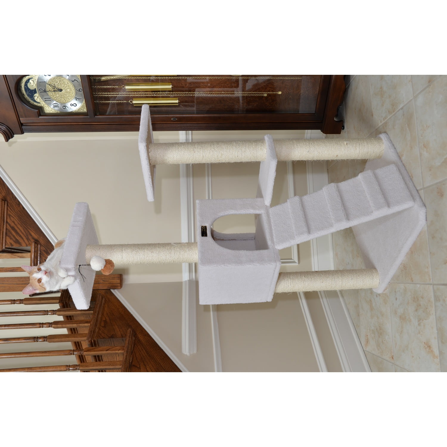 Easy to assemble with step by step instruction and tools. Extra Feature: Ramp. Covering Material: Faux Fleece. Covering Color: Ivory. Board Material: Pressed Wood. Overall Dimensions: 24 in. L x 22 in. W x 53 in. H. Base Dimensions: 22 in. x 20 in.. House Dimensions: 14 in. L x 12 in. W x 12 in. H. Perch Dimensions: 14 in. x 12 in.. Post Diameter: 3.5 in.. Max Holding Weight: 40 lbs..