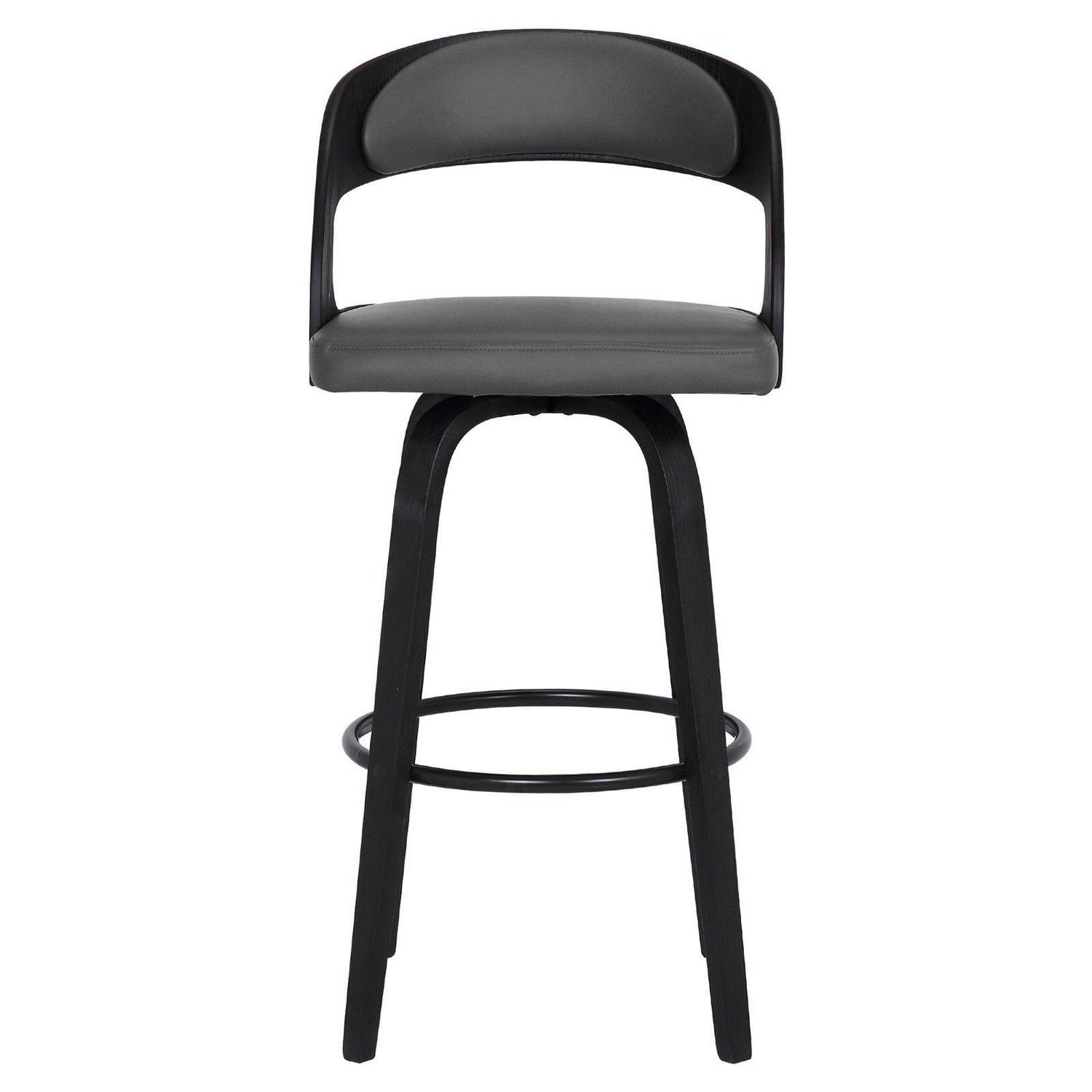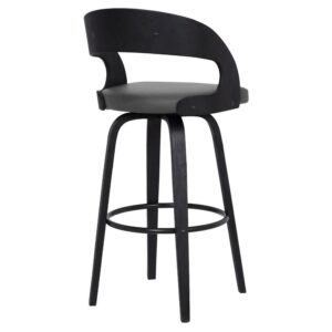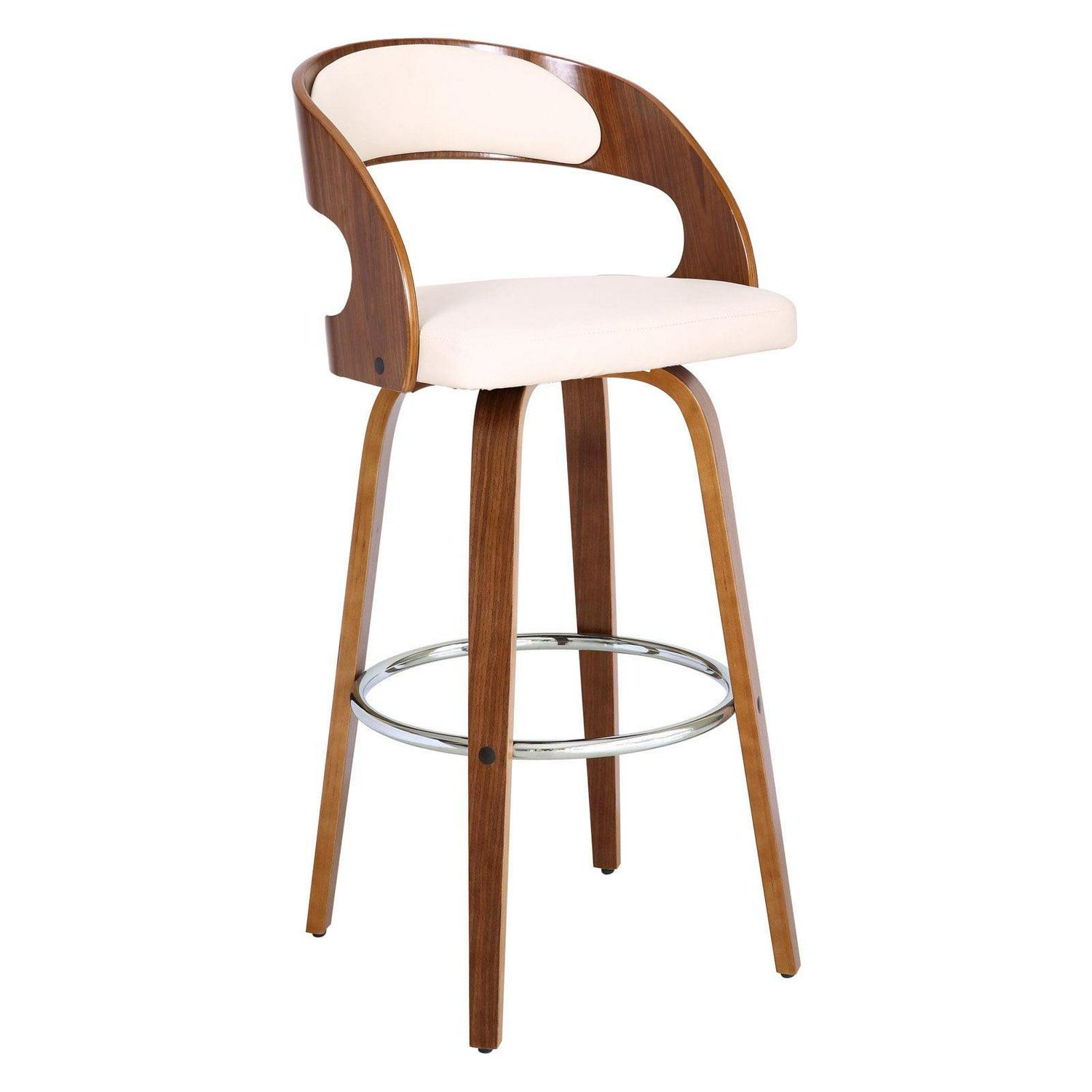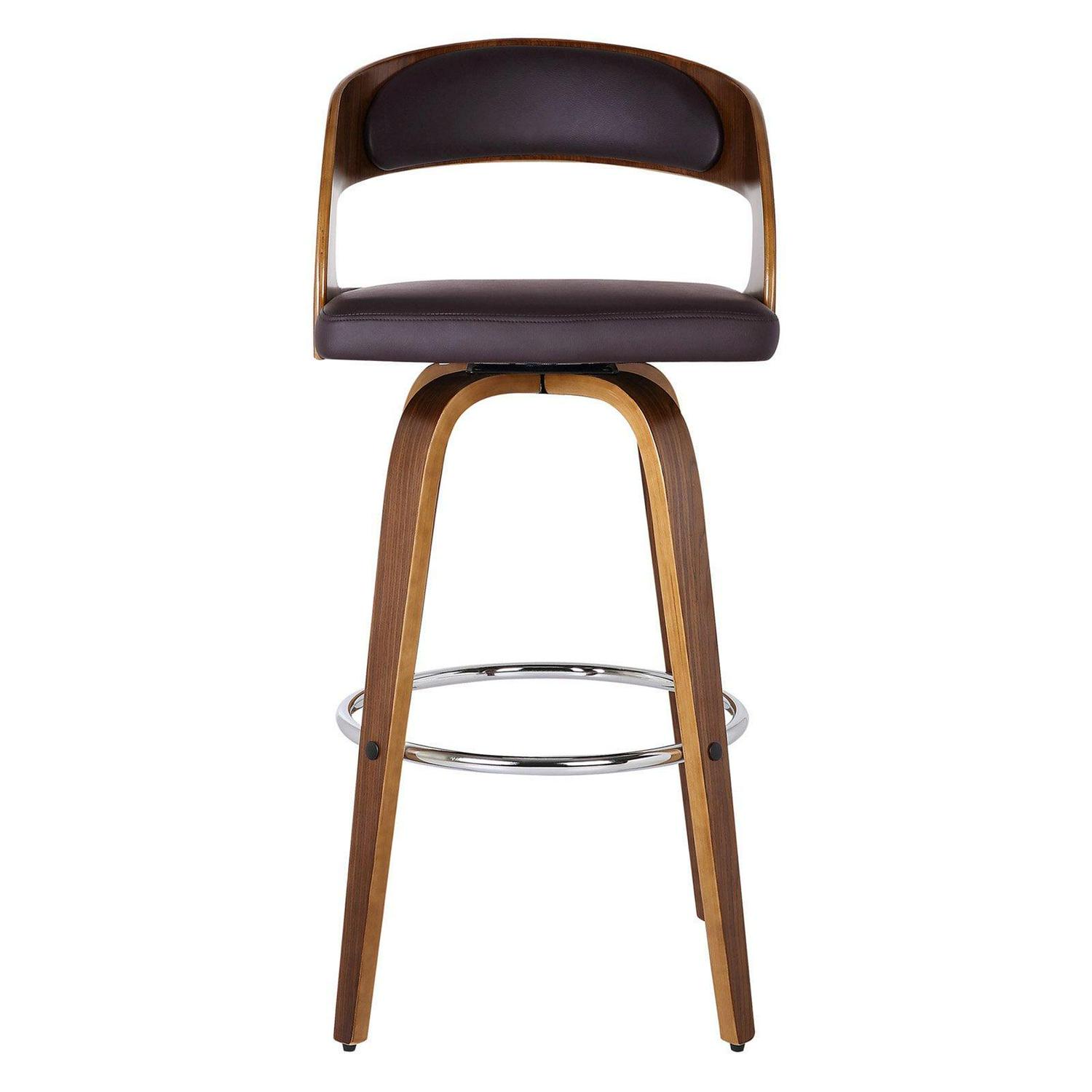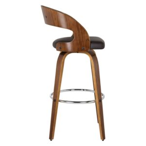 Everyday seating goes high design with the Armen Living Shelly 30 in. Swivel Bar Stool. Mid-century modern influences abound with this sleek and curvy bent wood barstool, tailored to the needs of the contemporary home. A 360-degree footrest of stainless steel connects four bent wood legs. You’ll love that it’s upholstered in brown faux leather that’s easy to care for and stain-resistant. The seat swivels on smooth ball bearings. Select from the available finishes.