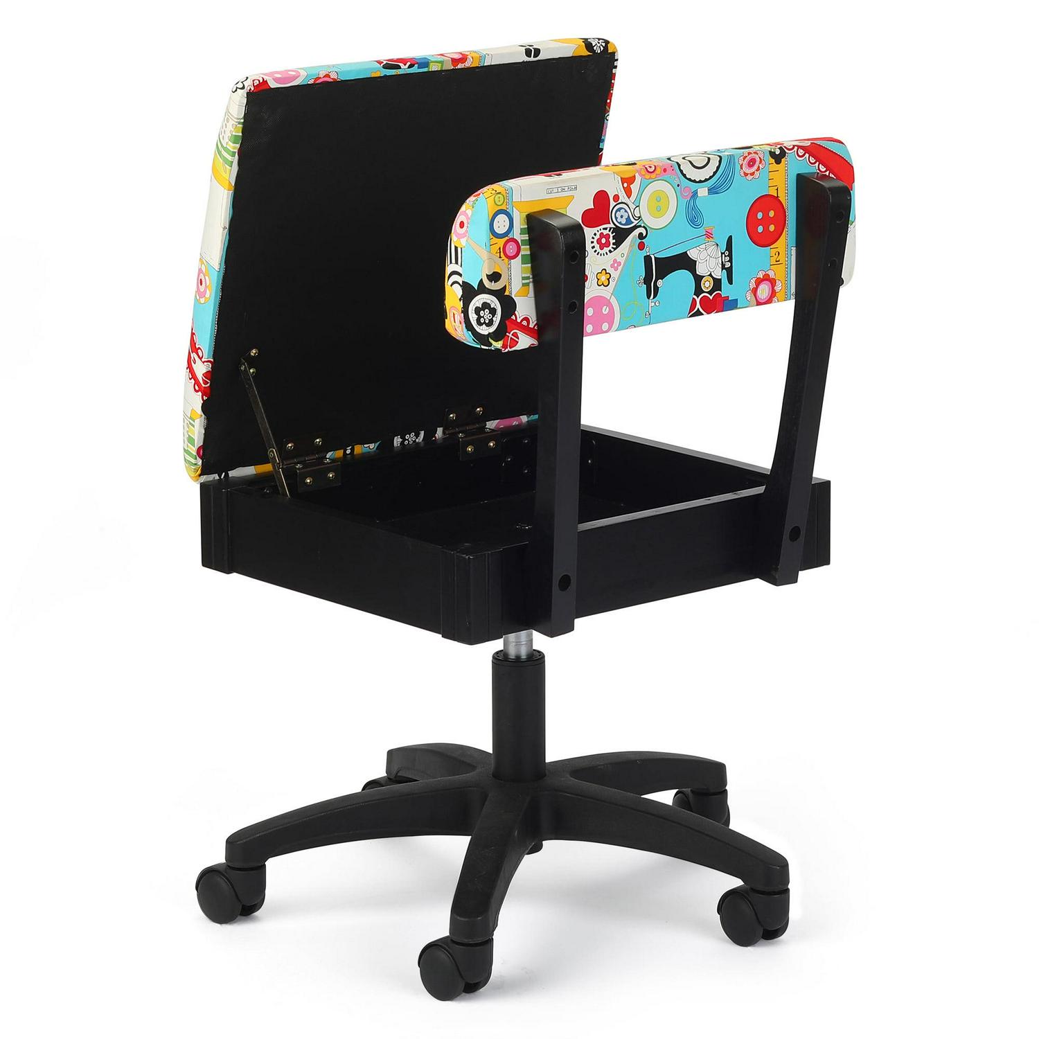 The Arrow Adjustable Height Hydraulic Sewing and Craft Chair provides comfort and ergonomic support, so you can sew all day long. Position the chair at just the right height with a simple press of a lever, and roll right up to center needle of your sewing machine on a sturdy star caster base with 5 casters. The chair s heavy-duty cotton upholstery fabric is available in whimsicle patterns to match your personal style.