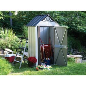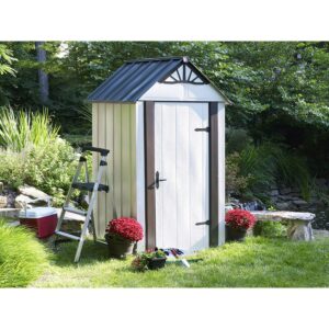 – SMALL FOOTPRINT OUTDOOR STORAGE: The Designer Steel Storage Shed is sized for smaller spaces and has a high gable roof for increased headroom and vertical storage space. Easily setup this metal shed on your balcony or patio.