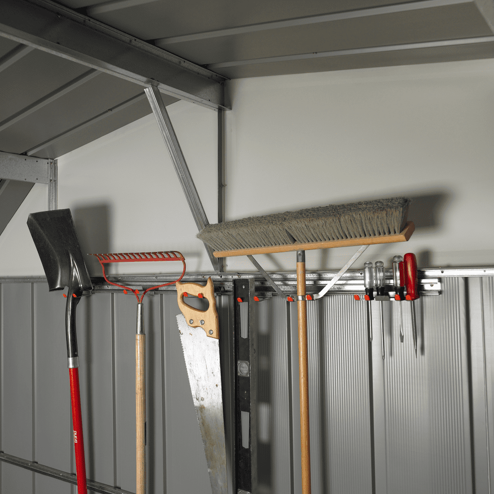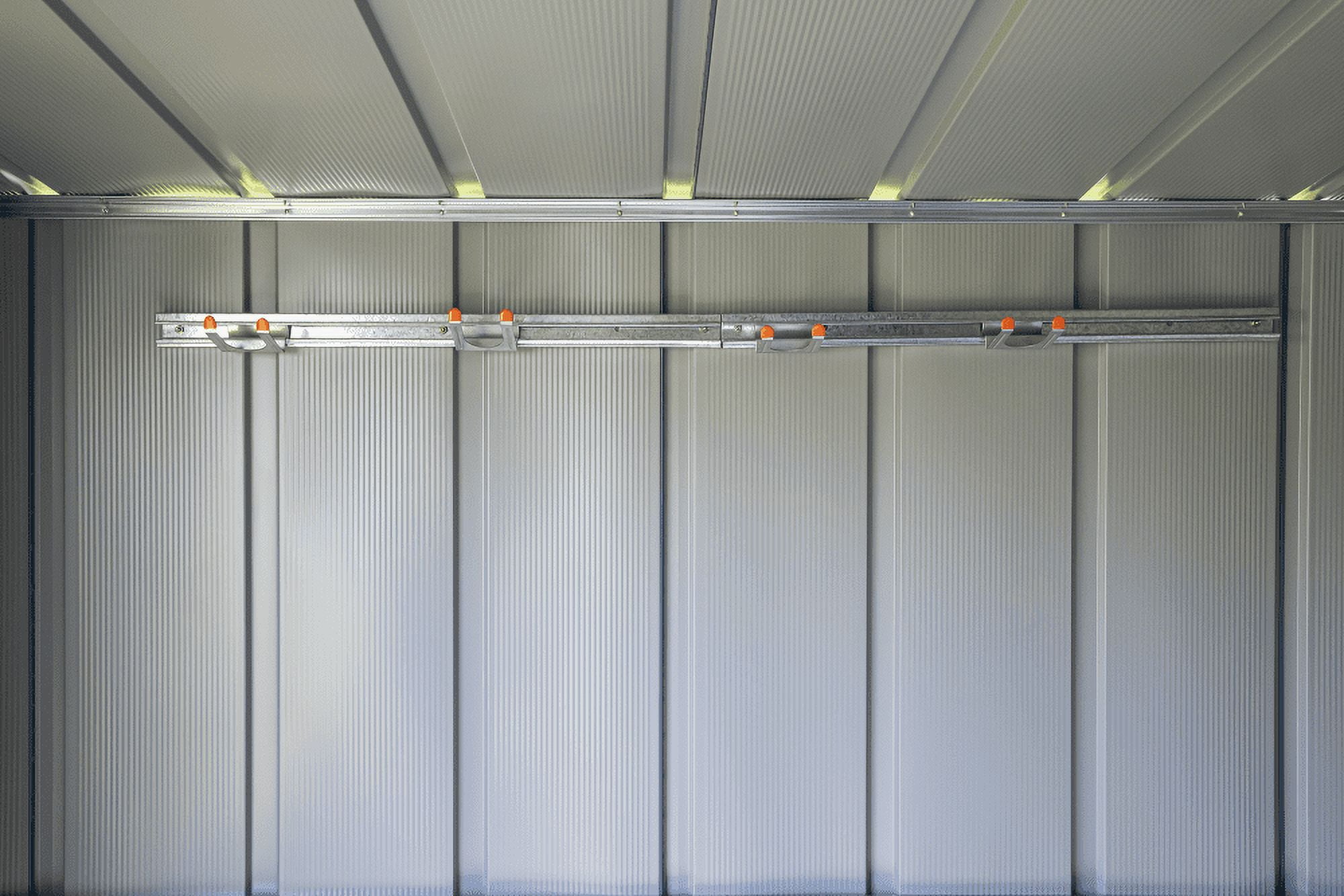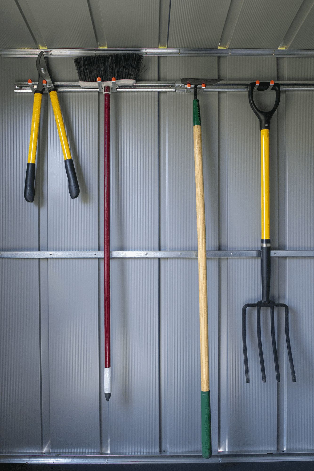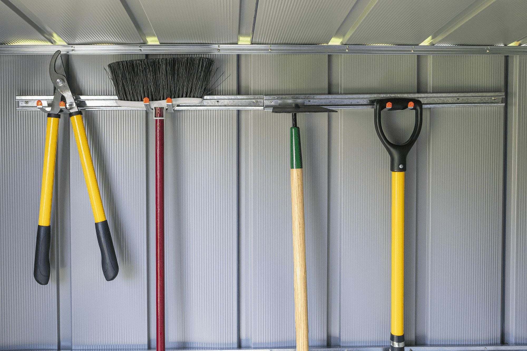 Arrow Sheds Tool Hanging Rack Material: Hot Dipped Galvanized Steel Color: Galvanized-Gray Assembled Exterior Dimensions: 51″W x 3.31″D x 1.86″H Assembly Required Includes: (2) 25.5″ Channels (5) Separate Large-Tool Holders that Snap into the Channel (1) Small-Tool Holder that Snaps into the Channel