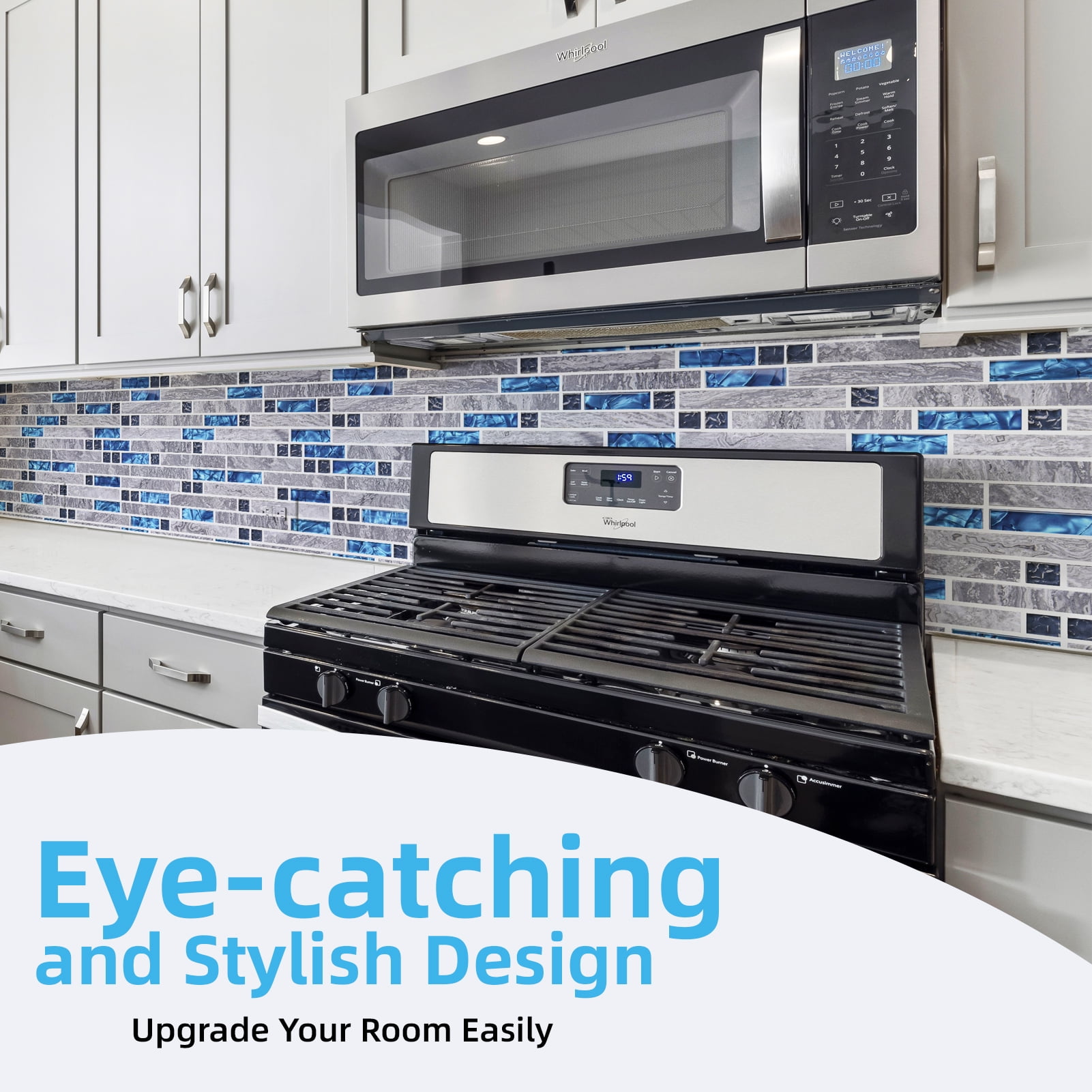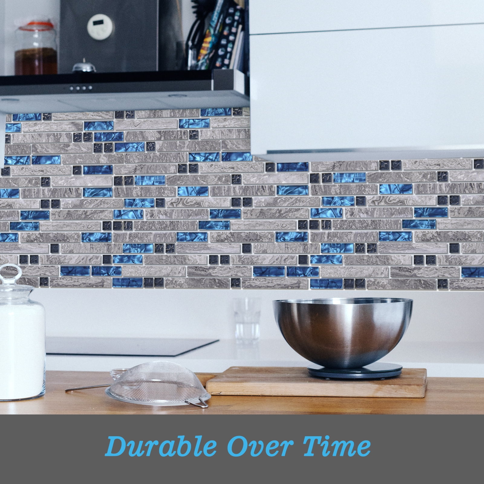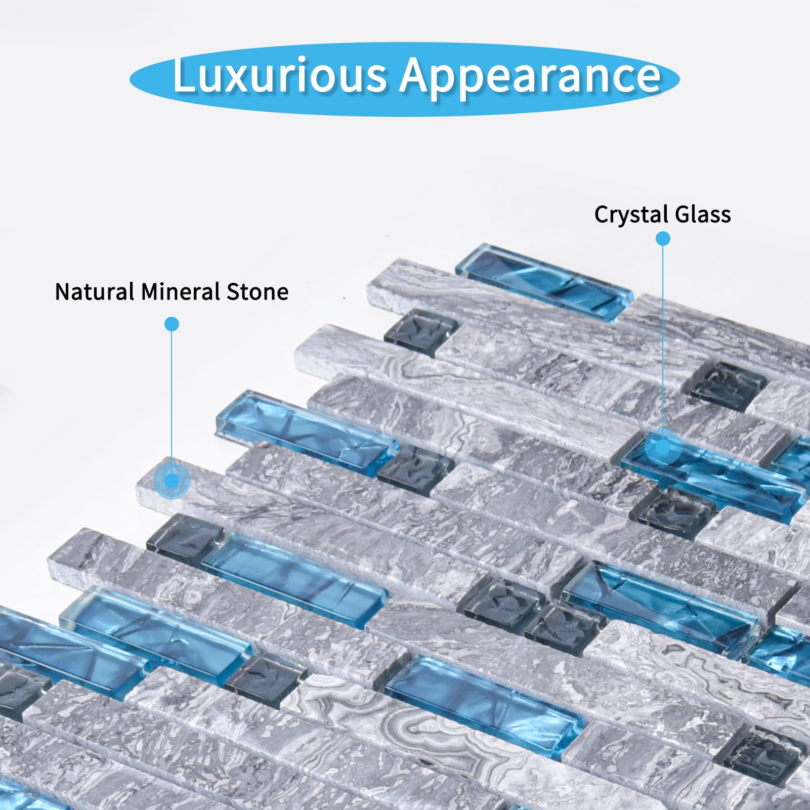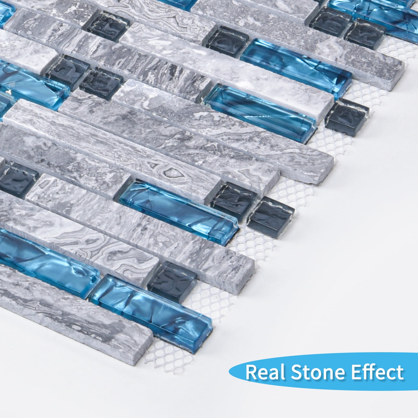 Art3d new stone glass tile is designed interlocking match, consist of blue crystal glass and grey Nature Stone. The color of the stone chips come from nature stone which is random, some looks grey and some are darker, we keep their nature color, did not add any artificial dyer. The surface has been polished to glossy while allows it to be gorgeous. The blue glass chips is made with the combination of premium vinyl blue substrate and crystal glass. The glass is come out from a high-temperature process, which makes it having strong impact, no fragile. The color will never fade. The tile is suitable for kitchen backsplash, accent walls, bath and shower walls, swimming pools. It can also be used outdoor