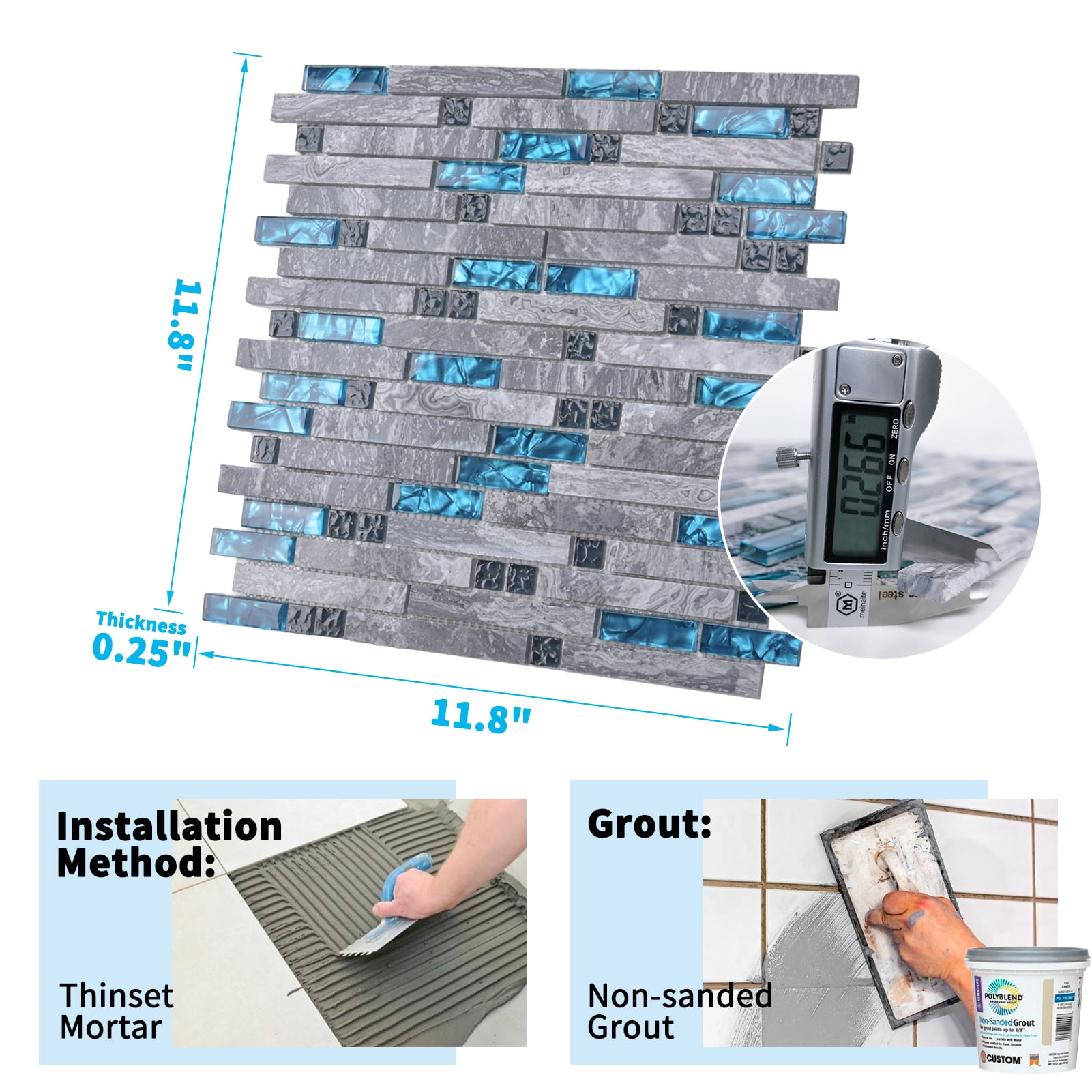 Material: Natural mineral stone + crystal glass Size of each tile: 11.8″ (W) x 11.8″ (L) x 0.25″ (H) Recommended Use: Kitchen backsplash, kitchen island walls, bathroom backsplashes, bedroom walls, shower walls, laundry rooms etc.