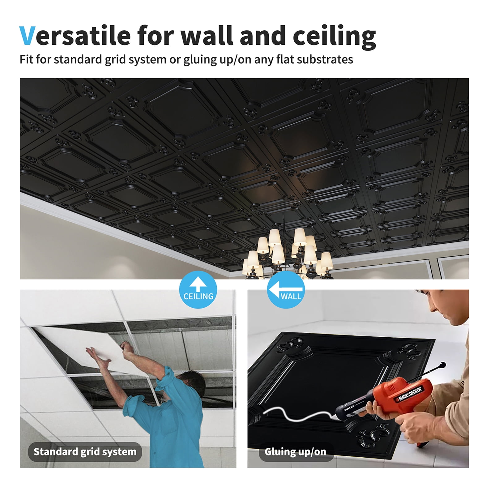 Art3d Drop Ceiling Tiles 24×24 in Black (12-Pack, 48 Sq.ft), Wainscoting Panels Glue Up 2×2