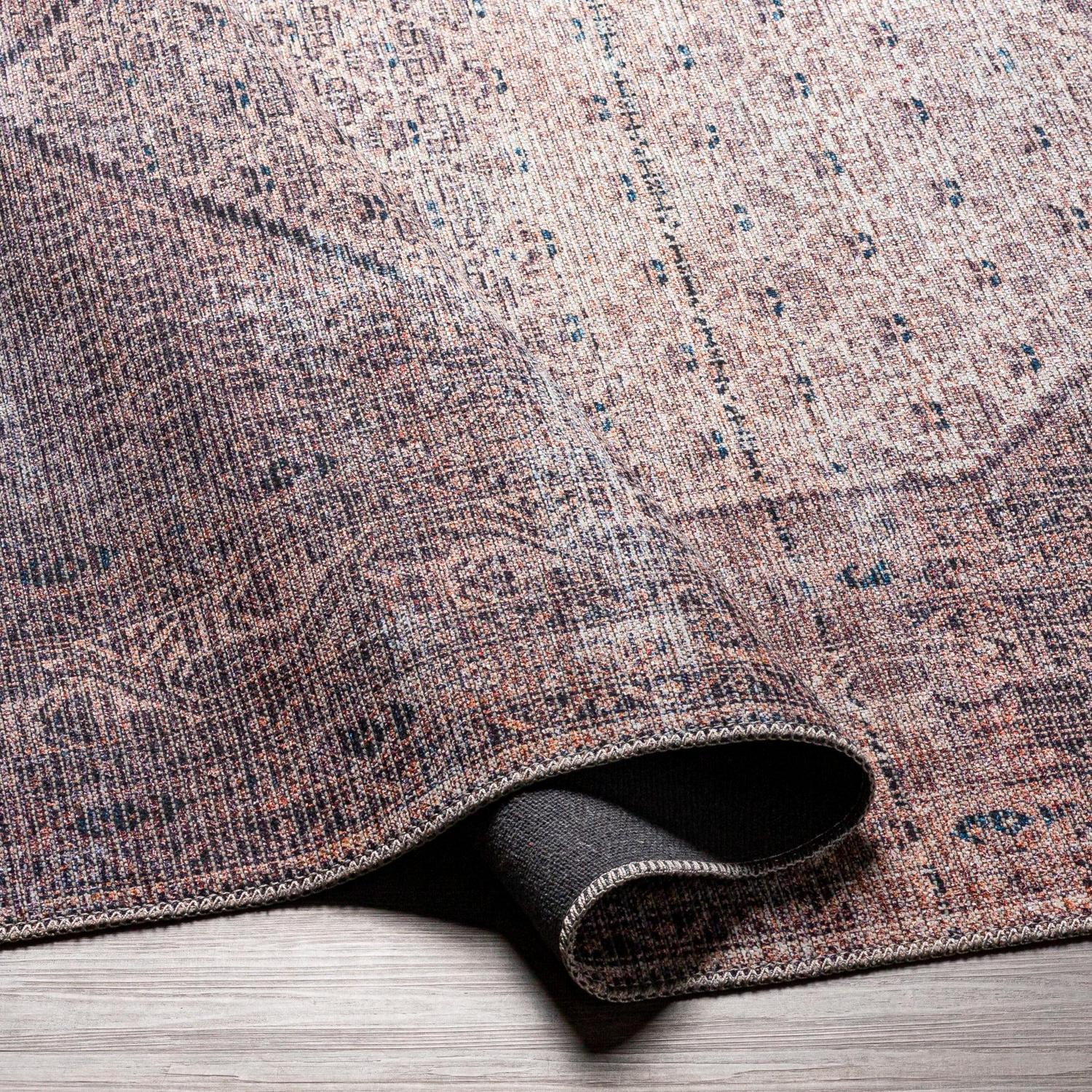 Invite mysterious charm into your home with the violet hints and neutral tones of the Christiansburg printed rug collection. Featuring a transitional heWaiting on Imagesogonal medallion, this moody rug is a stunning accent with traditional design. Pet and kid friendly, this rug is perfect for high traffic areas like an entryway or living room. Machine woven with 77% chenille-polyester and 33% cotton, a canvas backing, and a low pile of 0.2 inches in Turkey. A rug pad is recommended to prevent slippage and movement. Spot clean with a white cloth, one-year limited warranty.