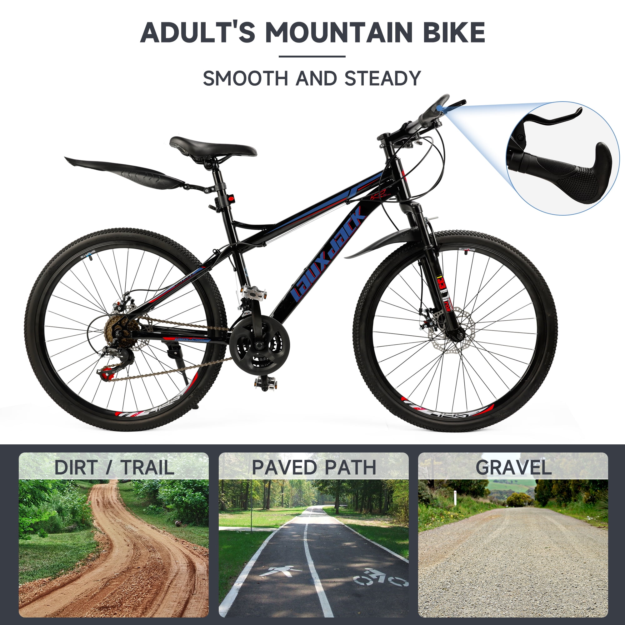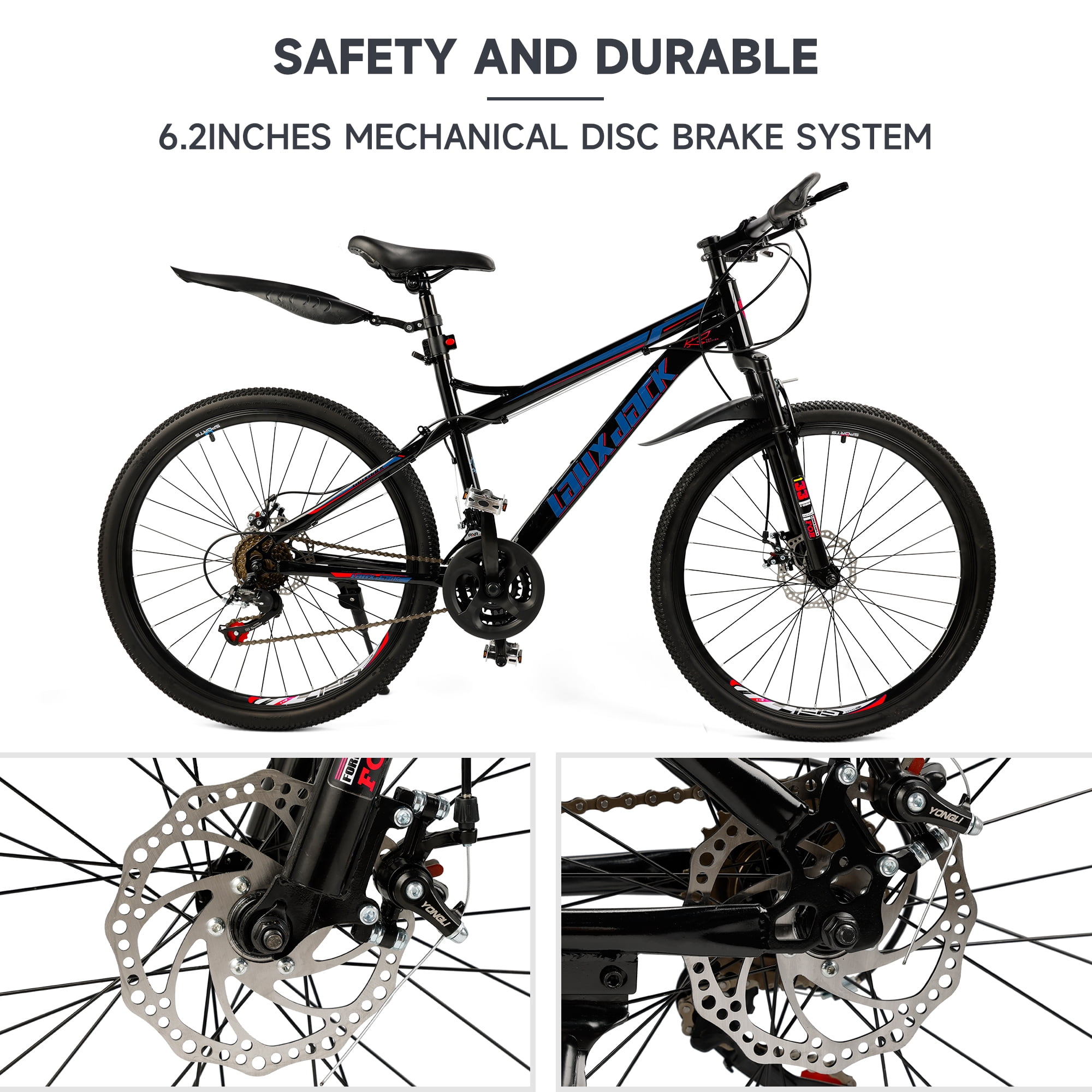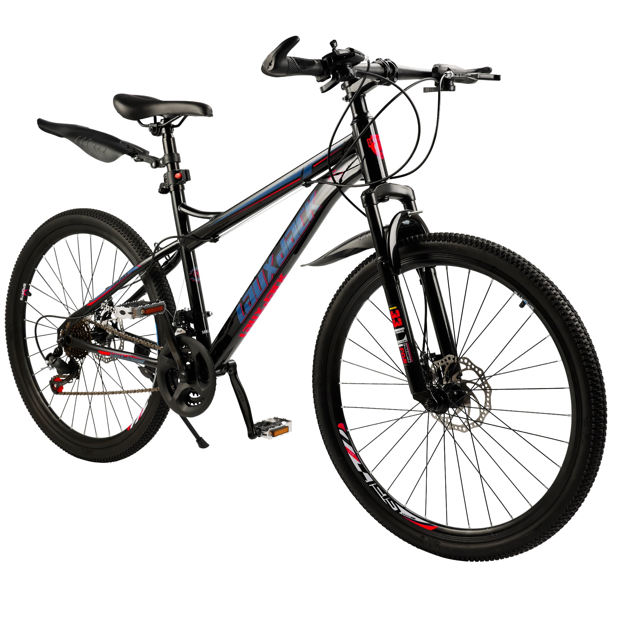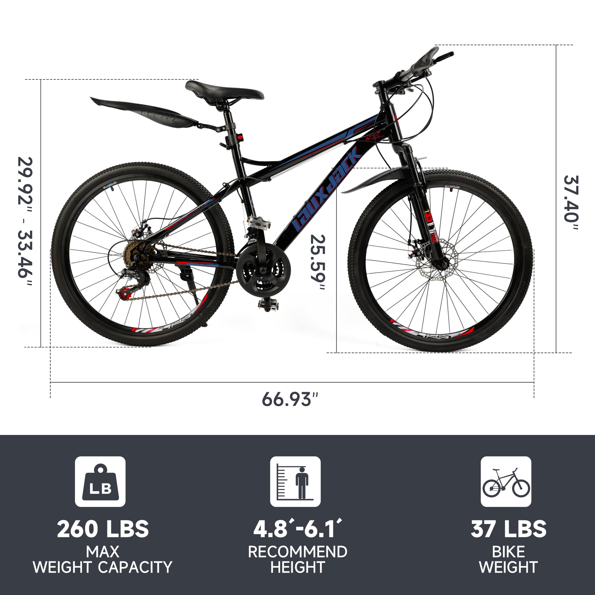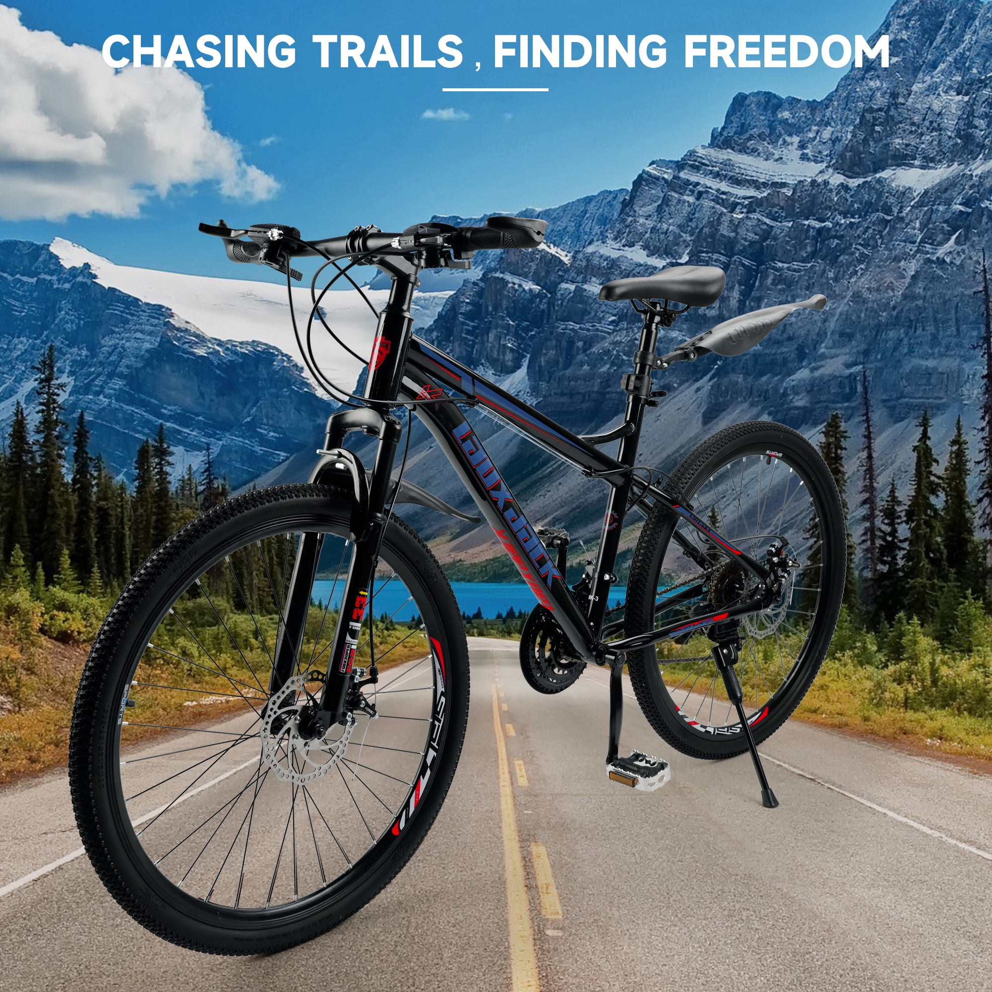 Versatile Design: Engineered for all terrains, from mountain trails to city streets, making it ideal for students, office-goers, and commuters alike. Pre-Adjusted for Precision: Each bike undergoes meticulous factory adjustments for seamless shifting and braking. The automatic adaptation of disc brakes ensures optimal safety. Easily fine-tune brake cable tension for personalized control. Effortless Installation: Simple assembly process ensures you hit the road swiftly, hassle-free.Specifications: Color: Red. Type: 21-speed, 26-inch mountain bike for superior performance. Frame: High-quality carbon steel frame for durability and stability. Front Fork: 31.8 Suspension Fork ensures smooth rides over rough terrain. Stem: Lightweight aluminum alloy stem for agility and control. Shifter Style: 7-speed Thumb Shifter for intuitive gear changes. Brakes: Double disc brakes offer reliable stopping power. Chain: 7-speed chain for efficient transmission. Cone Wheel: 7-speed cone wheel for smooth rotation. Chain Guard: Durable plastic guard for chain protection. Pedal: Comfortable PVC pedals for a secure grip. Rim: Aluminum alloy double-layer rim for strength and durability. Tire & Inner Tube: 26×2.125 dimensions ensure stability and traction. Saddle: Special color-matching saddle for comfort and style. Seat Post: Iron straight tube (28.6) for sturdy support.Package Includes: 1x Mountain Bike 1x Bike Lock 1x Air Pump 2x Bike Fenders