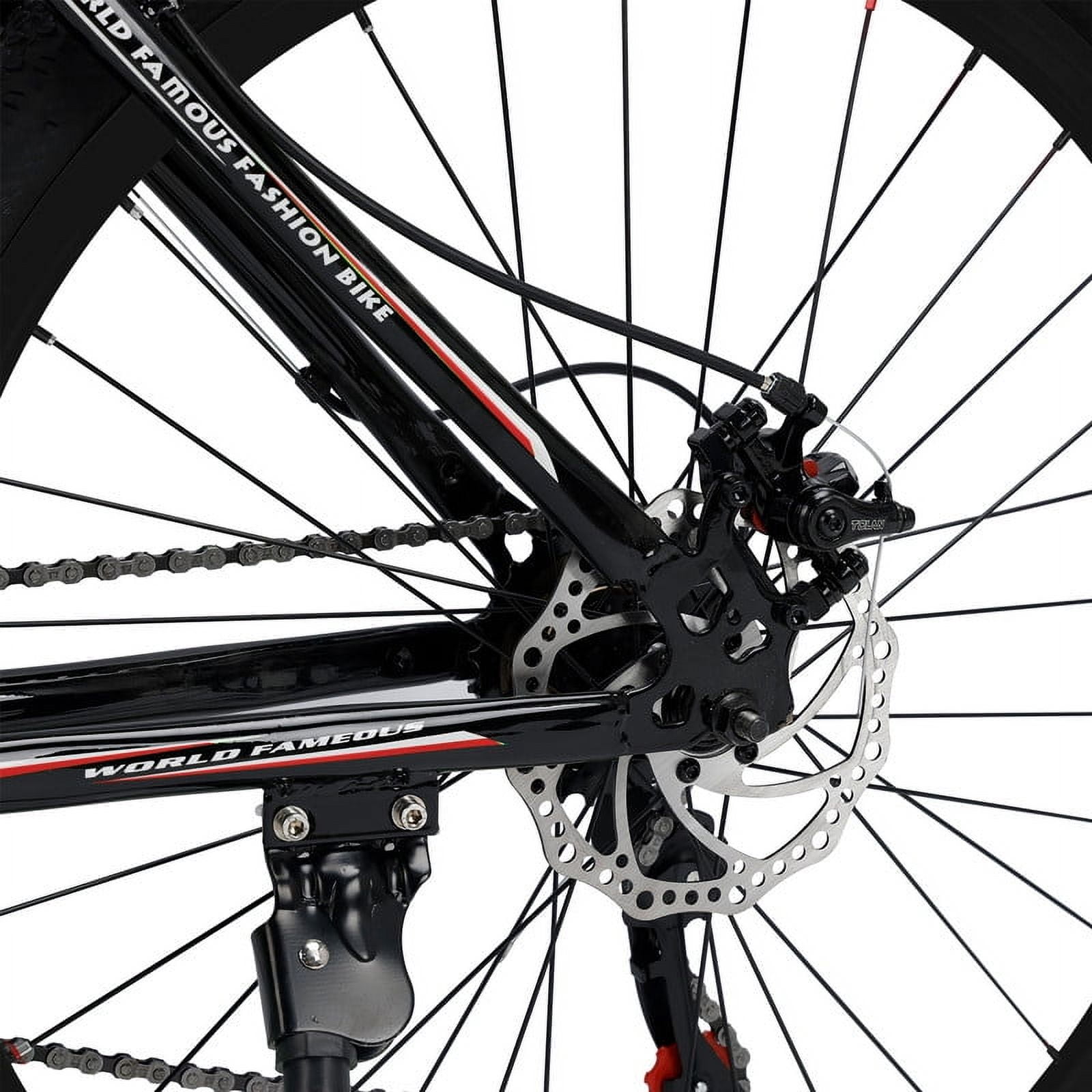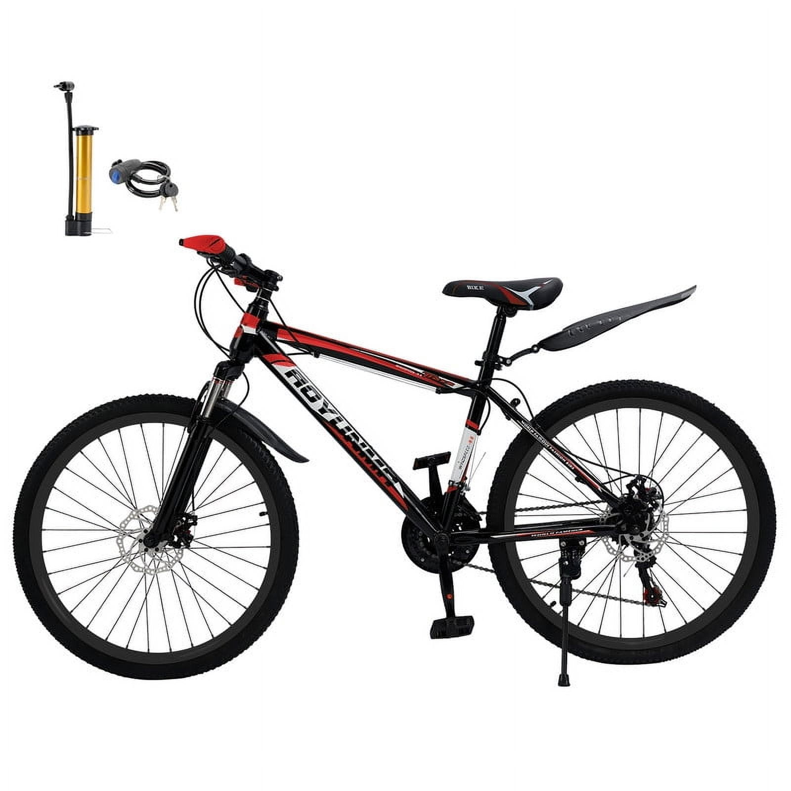 Gender Options: Available in both men’s and women’s designs for a personalized fit. Advanced Suspension: Experience unparalleled comfort and control with our state-of-the-art suspension system, engineered for smooth rides on any terrain. Reliable Disc Brakes: Equipped with high-performance mechanical disc brakes, ensuring precise and responsive stopping power even in challenging conditions. Factory-Tuned Performance: Each bike undergoes meticulous adjustment for optimal shifting and braking performance before leaving our facility. Automatic disc brake adjustment ensures hassle-free operation. Should you require further adjustments, our expert customer service team is always ready to assist. Easy Installation: Simplified assembly process for quick setup. Reach out to our customer service team for any installation guidance you may need.Specifications: Color: Customizable decals integrated into the paint finish for a sleek look. Speed: 24-speed transmission for versatile riding experiences. Frame: Crafted from high-quality, lightweight high carbon steel for durability and agility. Front Fork: Enhanced with a responsive spring suspension fork for superior shock absorption. Hub: Features a robust disc brake hub for reliable performance. Center Shaft: Utilizes a 3S sealed shaft for smooth and maintenance-free operation. Shift Control: Easy-to-use one-piece thumbshift for seamless gear changes. Chain: Durable 110-variable speed chain for smooth power transmission. Flywheel: 8-tower wheel design for efficient pedaling. Brakes: Dual-disc brakes for enhanced safety and control. Rim: Aerospace-grade aluminum alloy rims for strength and agility.Package Includes: 1 Mountain Bike 1 Assembly Tools 1 User Manual 1 Bike Lock 1 Air Pump 1 Bike Bell 1 Cup Holder as a special gift