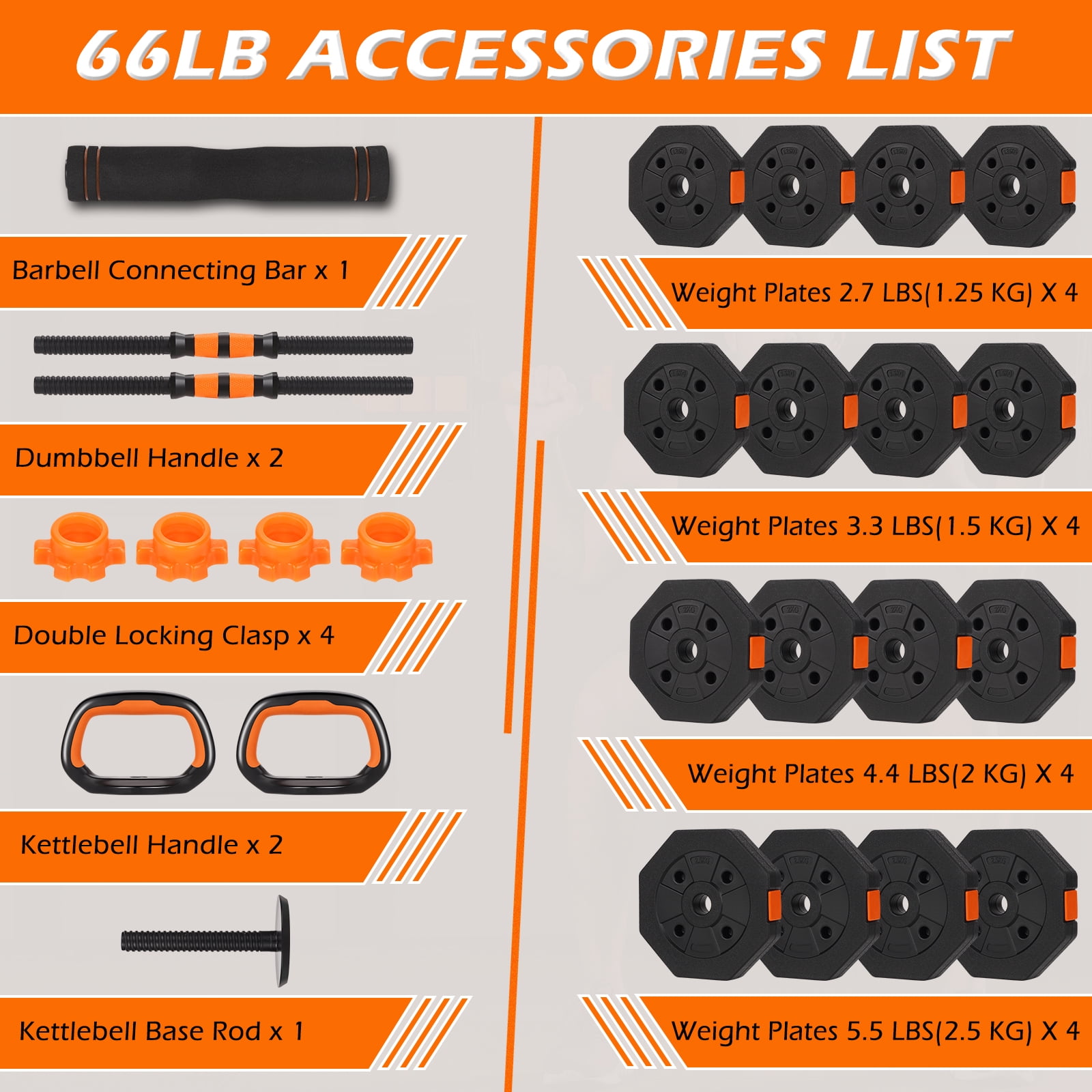 ARVAKOR 66Lbs Adjustable Dumbbell Set – Octagonal Anti-Roll Design, Non-Slip Grip, Versatile Weights with Barbell, Kettlebell, Push-Up Options, Orange