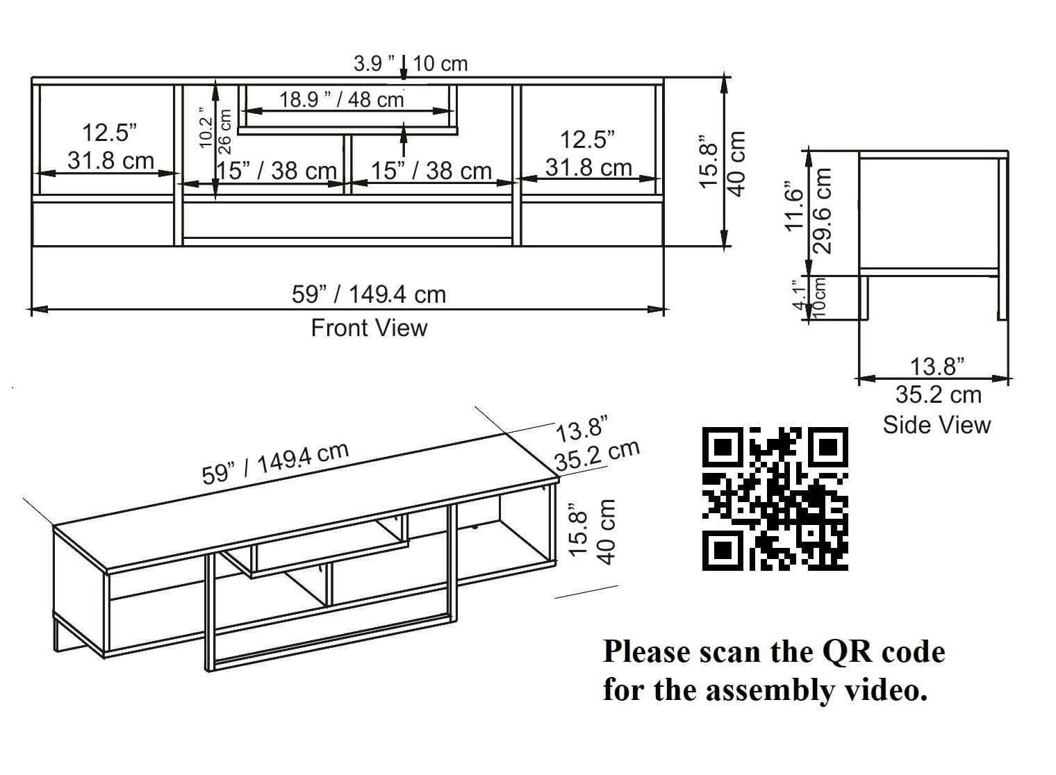 Open Shelving Design – Reversible TV Stand – Made of 18mm Manufactured Wood – Easy to Assemble – Accommodates TVs up to 65 in. – First-Grade Metal Frame – Height: 15.8 in. / Width: 59 in. / Depth: 13.8 in. / Weight: 40 lb. Asal 59” wide simple and minimalist media stand for TVs up to 65” is defined by practical functionality and streamlined design. Offering three stylish open shelves, this design includes 18.9 inches wide and almost 4 inches high an area in its center that’s perfect for a TV tuner, remote controller or other small media devices. Top this design with a sleek flat screen TV, then deck out the interior open shelves with your favorite books and DVDs, framed family photos, and hurricane candles, while using the middle shelf for your new video game console and the cable box. The media stand is made of 18mm thick melamine coated particle board and banded with PVC edge banding tape. The stand is also enhanced and strengthened with front metal leg which makes it sturdy and durable. Metal part is coated with scratch and impact resistant industrial static paint. It is manufactured using eco-friendly and health-friendly TSE certified materials. The product will be delivered to the customer in original package as disassembled. It is designed to be assembled by the customer easily using a power drill or screwdriver. Assembly instruction and installation hardware are included in the package. For fast and error-free installation, product parts are numbered with stickers in accordance with the assembly guide.