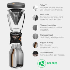– FRESH AND COLD- Our airtight and leak proof lid keeps your coffee securely where it belongs while the double walled copper vacuum insulated construction ensures fresh iced cold coffee for hours. Once the coffee is brewed it easily gets released into the on the go mug with a press of a button and your coffee stays fresh and cold for up to 24 hours