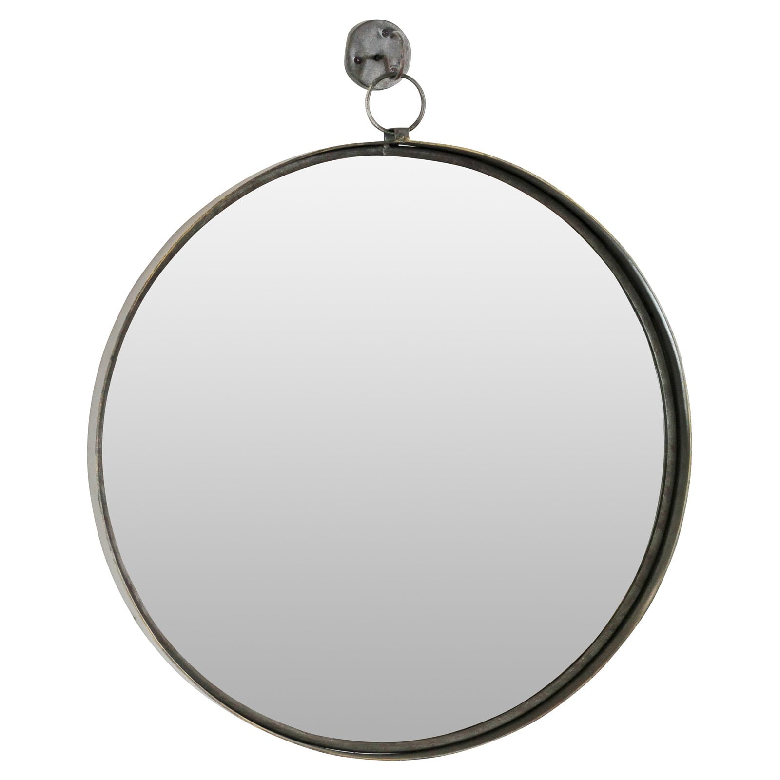 The Aspire Home Accents Bescott Suspended Round Wall Mirror – 24W x 2D x 28H in.brings industrial style to your space. The sturdy iron frame features a dark antique brass finish. It’s suspended from a matching hook to create a dimensional look.