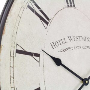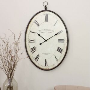 With it’s French country design inspiration, this oversized wall clock is perfect for bringing a charming country feel to your space. Featuring an iron pocket watch design oval frame surrounding a roman numeral clock face. The neutral finishes in the clock make it versatile enough to fit well with any color scheme.