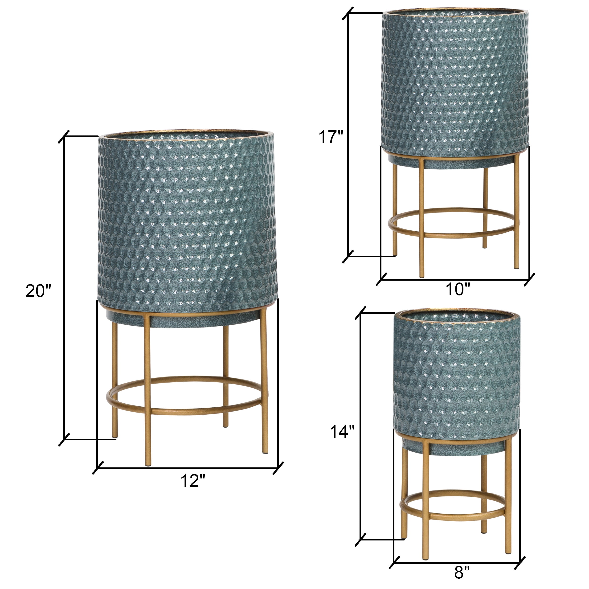 Crafted from metal Blue-green finish planters with golden legs Set of 3 Glossy embossed round planters for plants Recommended for indoor use Not for direct planting Aspire Home Accents