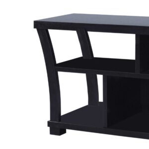 Astonishing Entertainment TV Stand, Black- Saltoro Sherpi Enjoy the latest shows and movies while being delighted by the beauty of this Entertainment TV Stand. It has a sturdy wooden construction in Black finish. Four curving legs narrow to smaller footprint base, giving character to the stand and making it feel smaller. The stand features five open shelves that provides a unique surface for displaying media players, books and decorative accents. The top of the TV stand offers a sleek surface for TVs of multiple sizes. Whether you are entertaining at home or relaxing with the family, this Entertainment TV stand is sure to be the center of attention!