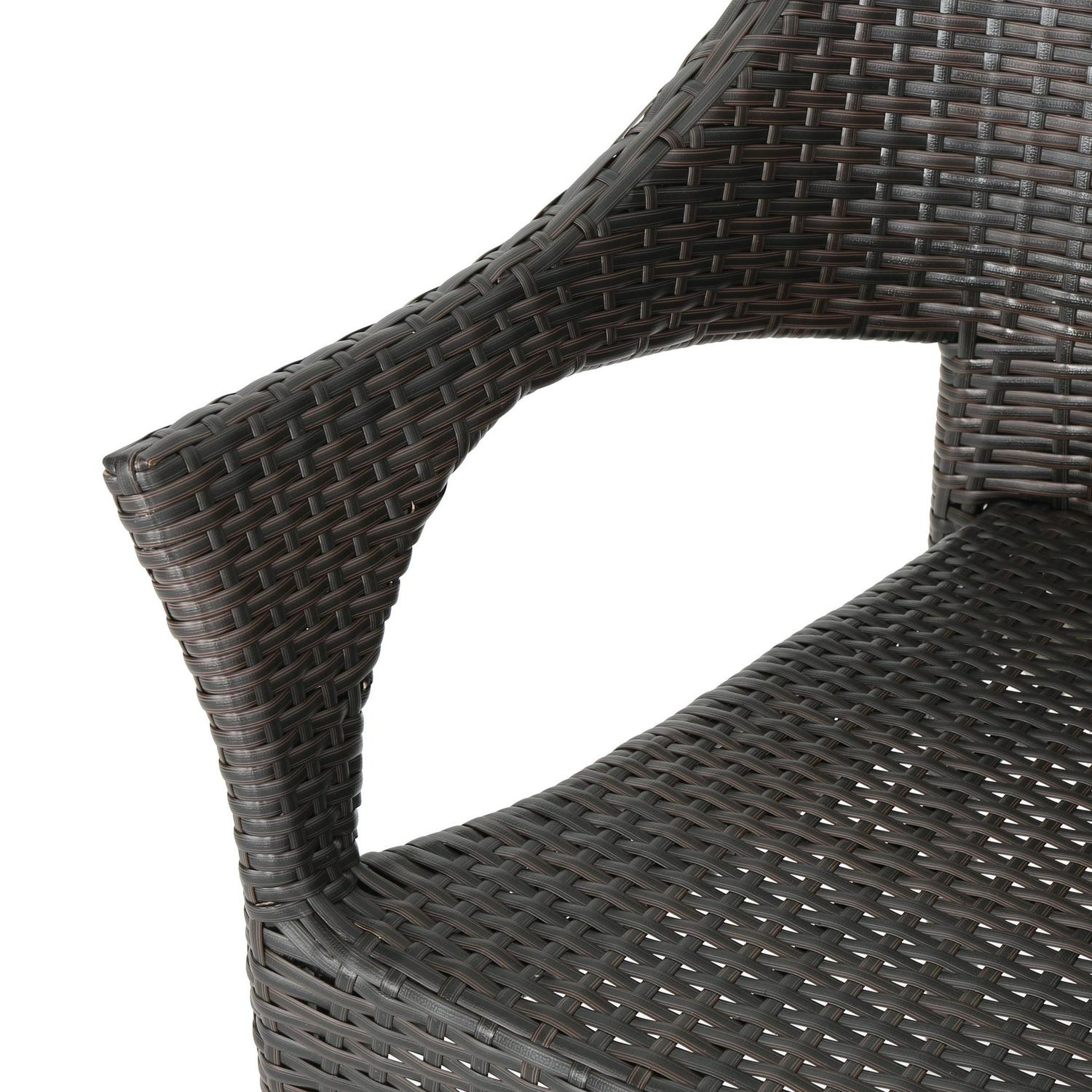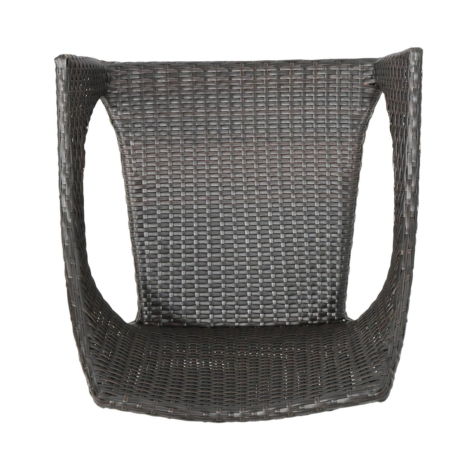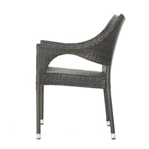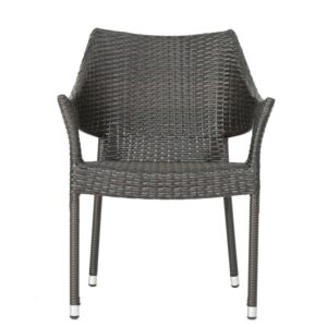 This outdoor chat set has been uniquely paired for your convenience. With two stacking wicker chairs, this set is both unique and comfortable. The stacking feature of the chairs allows you to easily store these chairs and the table in one place when you need this set out of the way. The table is made with sturdy wicker that is great for outdoor use and will be perfect for anything you want to use it for.
