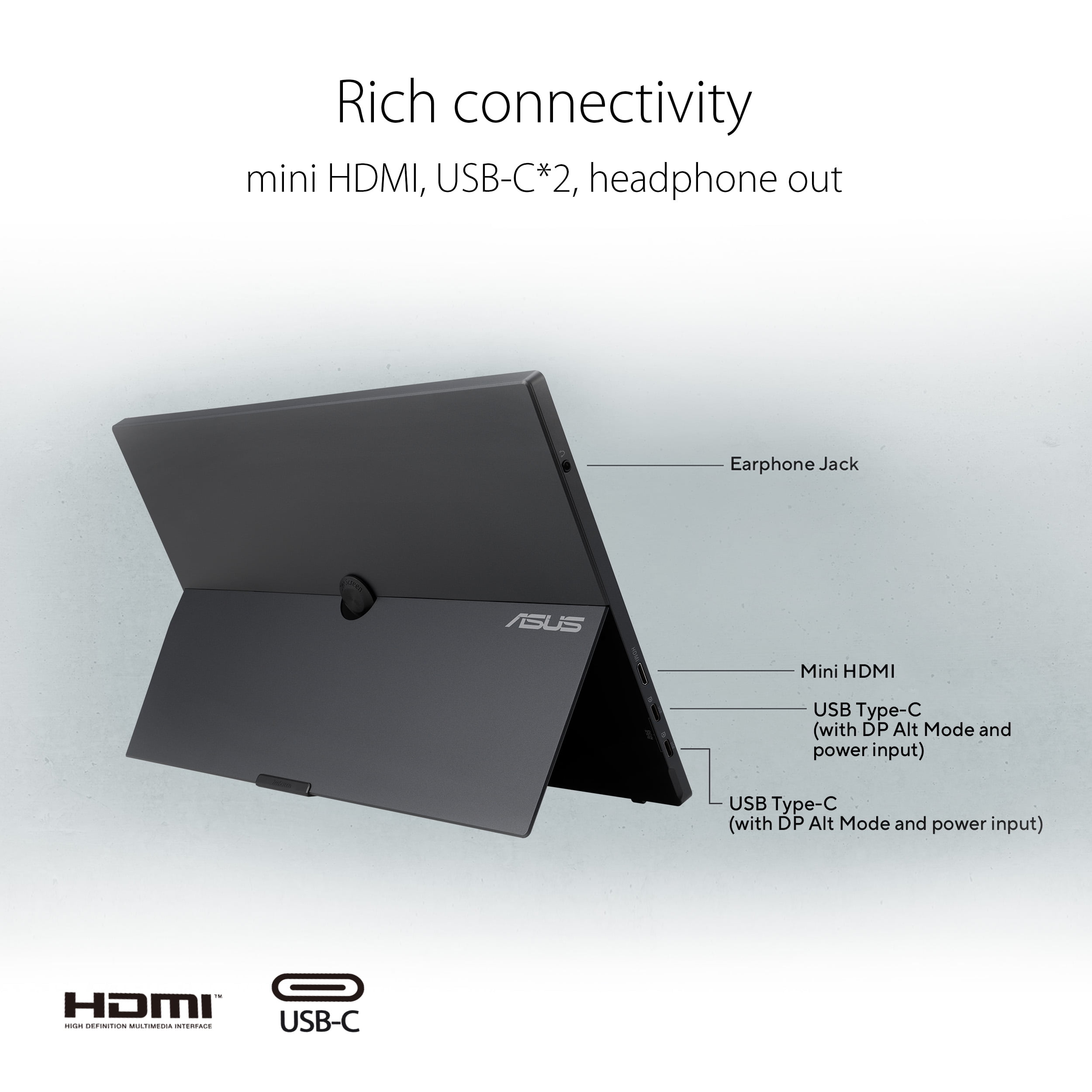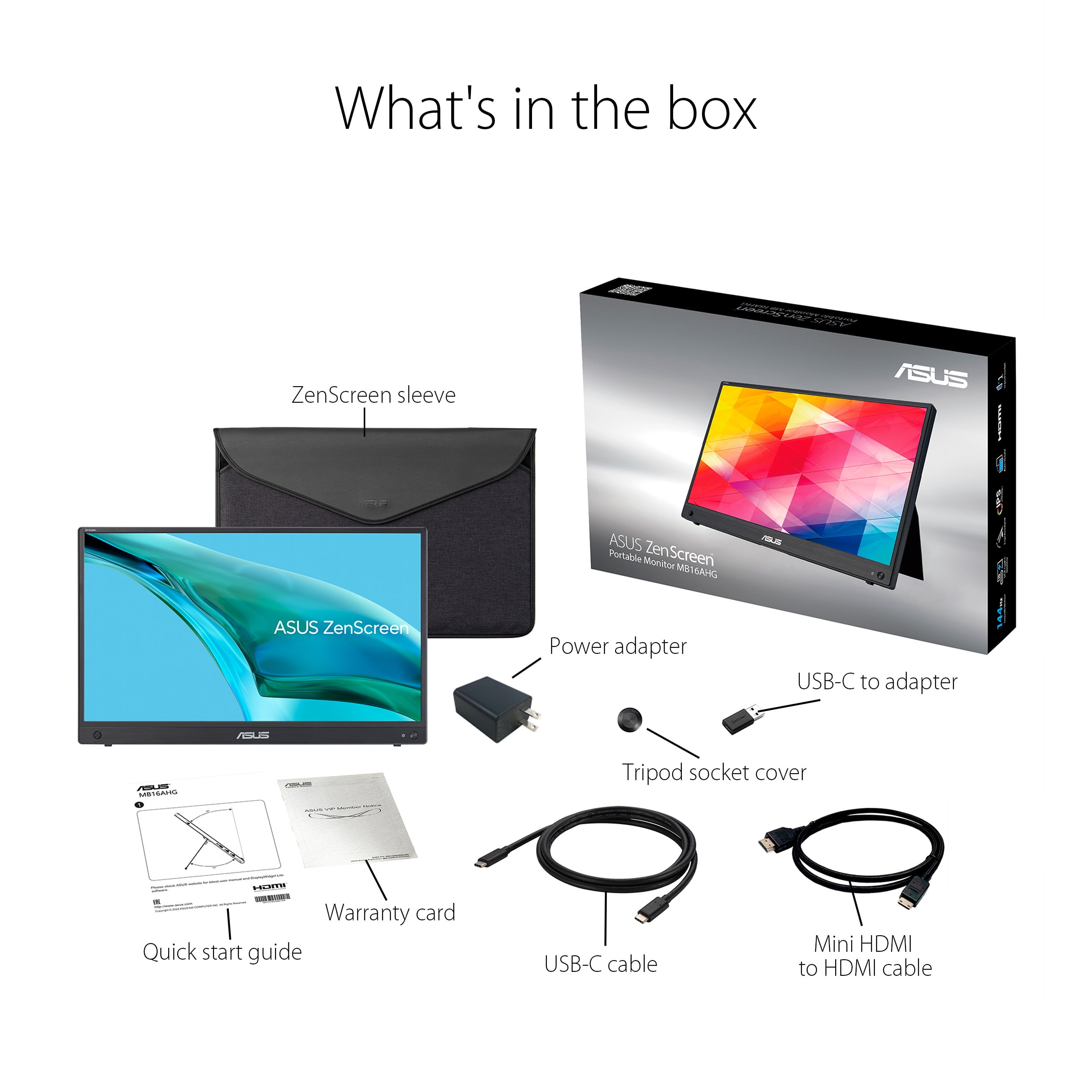 ASUS ZenScreen MB16AHG is a 15.6-inch IPS FHD portable monitor with fast 144Hz refresh rate and Adaptive-Sync(FreeSync™) technology to eliminate screen tearing and choppy frame rates for the smoother-than-ever experience. A fold-out adjustable stand enables a multitude of tilt angles to ensure comfortable viewing. Dual USB-C™ and mini-HDMI connectivity enables displaying content from a wide-range of devices, so you can enjoy an expansive view for the best work and entertainment experiences, wherever you go. ASUS ZenScreen MB16AHG is ideal for life on the road. This sleek portable display weighs 0.92kg and has a slim profile, so it fits easily in any travel bag and is ready for productivity, anytime and anywhere. A sleeve included in the package helps protect the MB16AHG from dust and scratches while traveling. A fold-out kickstand props ASUS ZenScreen MB16AHG up on any flat surface and offers easy tilt adjustments to ensure comfortable viewing angles and working positions. In addition, a ¼ -inch threaded tripod socket at the rear lets you attach the monitor to a standard tripod* or table mount.