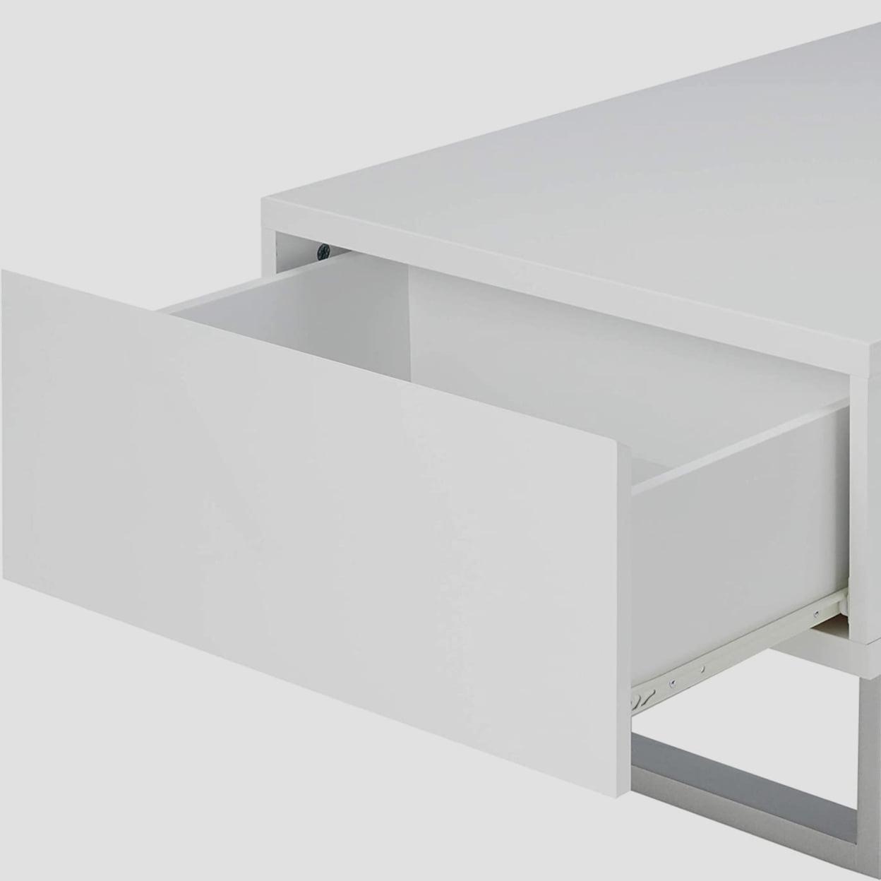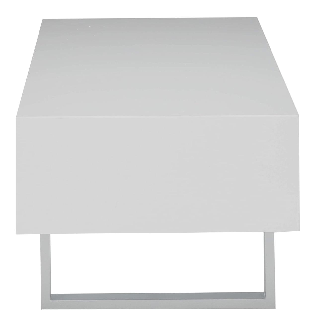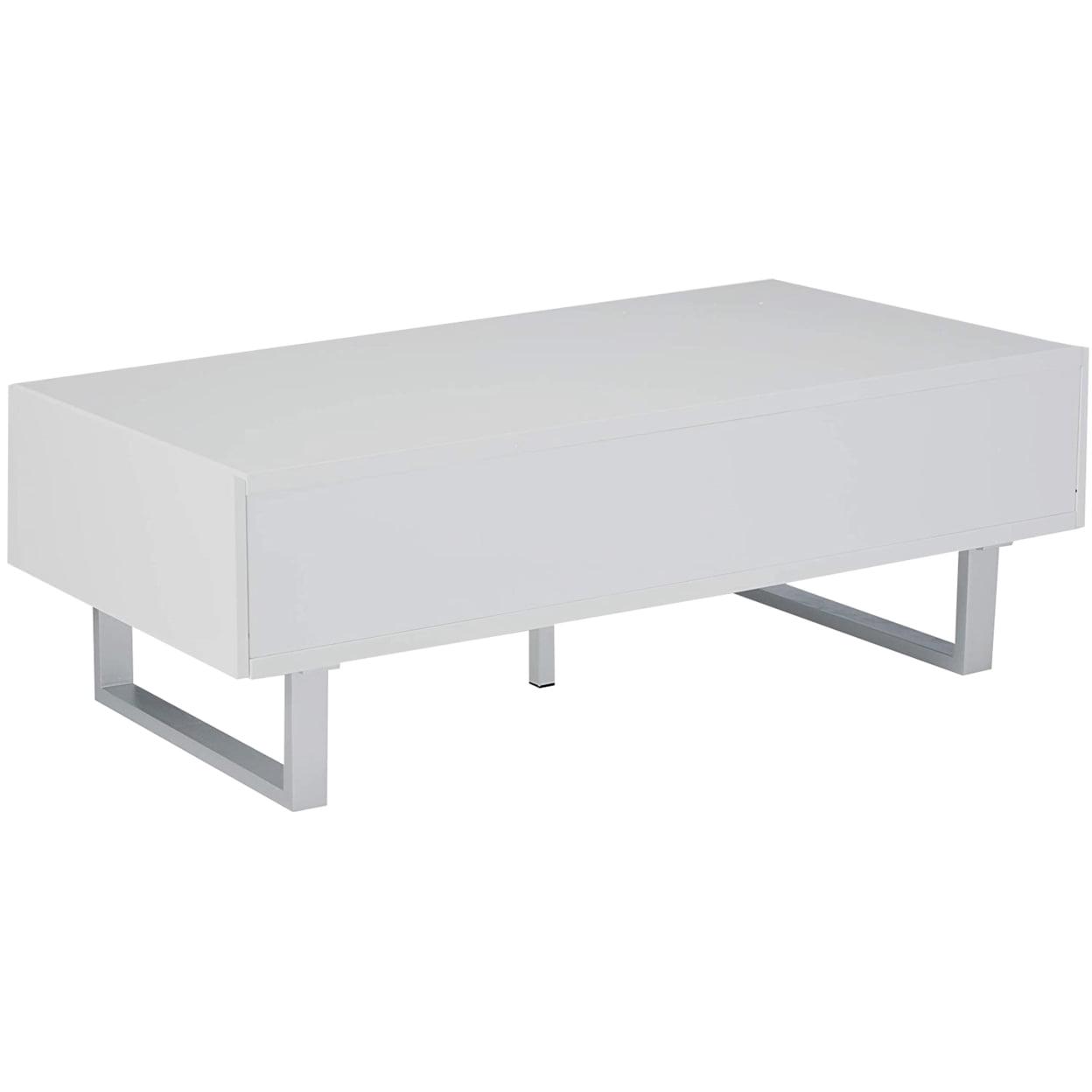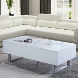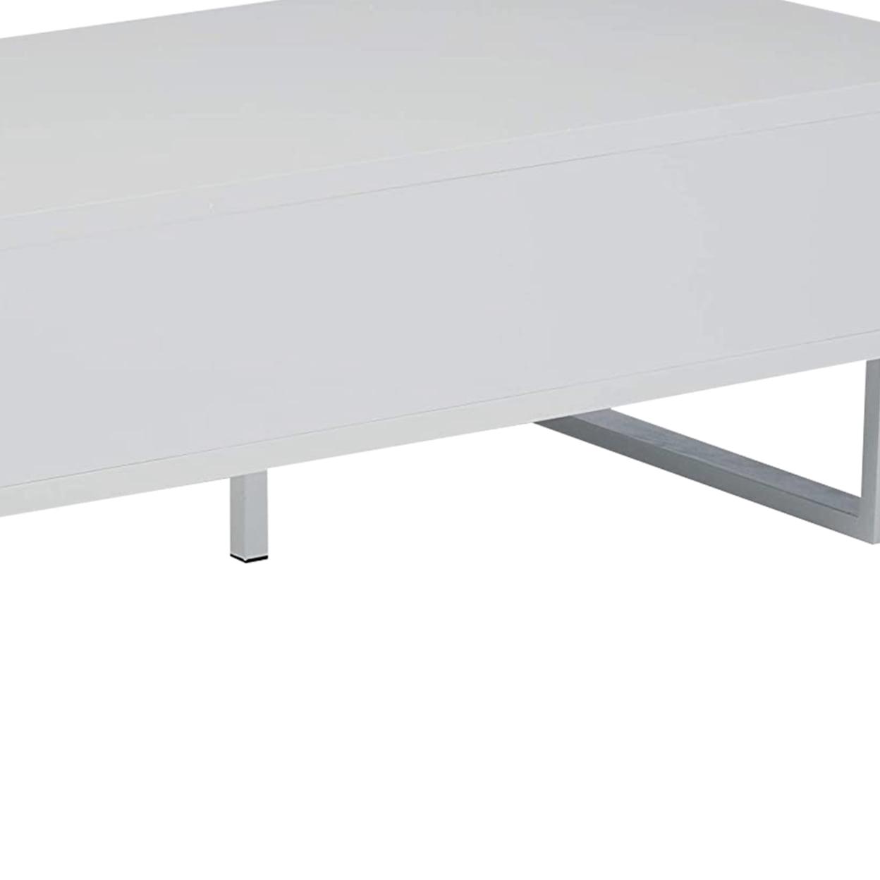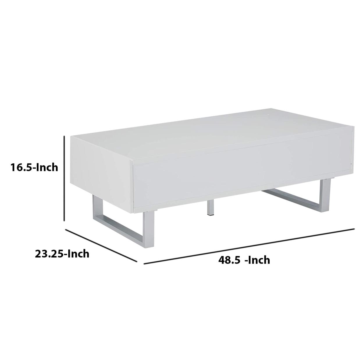 Contemporary Storage Coffee Table With Metallic Base, Glossy White- Saltoro Sherpi Compliment your serene interiors with this immaculate and contemporary coffee table in pure white finish making it a center piece or focal point with visual appeal. With smooth straightforward design and unique shape this table has box like shelf in rectangular storage. It features high glossy white finish suitable for contemporary decor. Constructed of solid wood and silver metallic base its an appealing, sturdy and long-lasting furniture piece to take your decor on next level up!