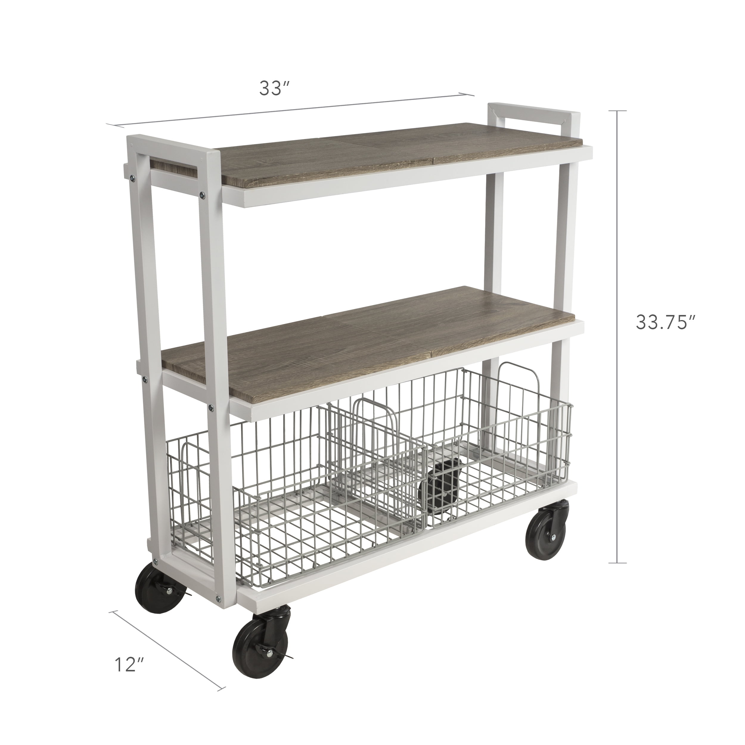 Durable powder-coated tubular steel construction 1 premium laminated shelf 2 sturdy, totable wire storage basket with liner 2 interchangeable shelves 4 casters (2 locking) for effortless movement Additional interchangeable baskets and shelves available Easy to clean Assembled Dimensions: 33.00″ W x 12.00″ D x 33.50″ H Assembly required Ships in one box
