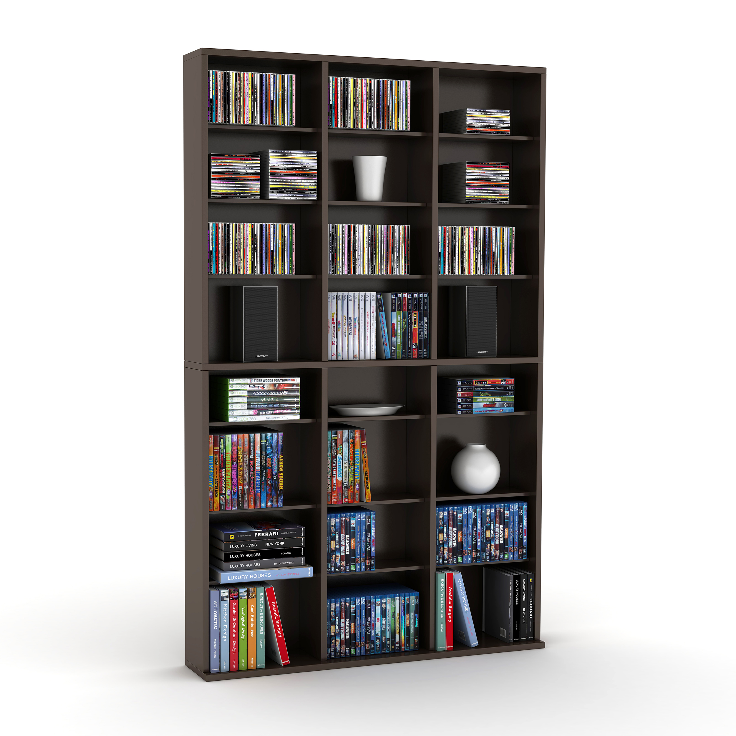 You’ve got a lot of CDs, DVDs, Blu-Rays, games and books; you want to show them off, without overwhelming your living space. Impressive height and expansive width, yet with slender lines – Oskar let’s you keep a feeling of lightness in your decor while displaying even a hefty media collection. Rich espresso color lends a coastal feel to a handsome design that will shine anywhere from bedroom, to den, to home office. Features: Multimedia storage for 414 Blu-rays, 360 DVDs, 756 CDs. Large collection media storage cabinet Adjustable shelves for better media organization Extended base for stability Durable frame Wall anchor kit included Specifications: Included: Hardware Number of Shelves: 9-Tiers; 3-Columns