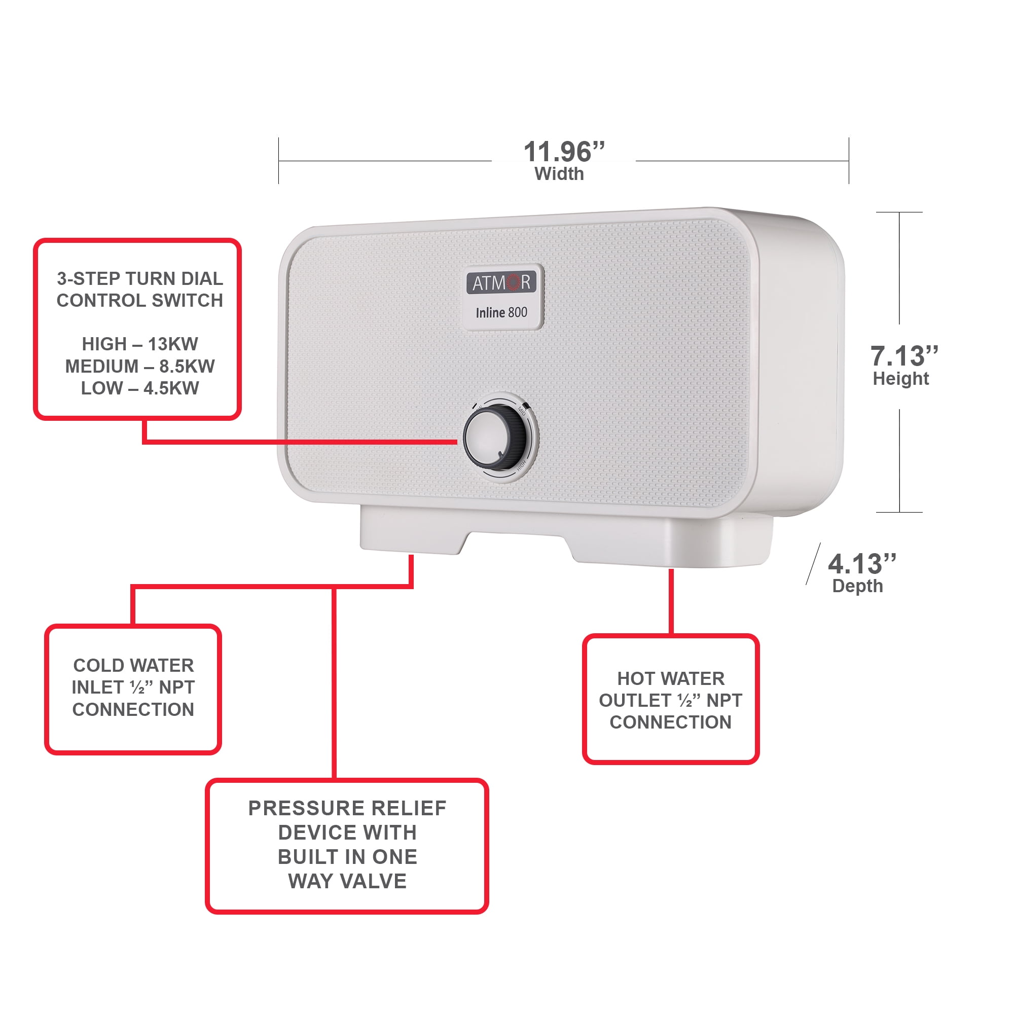 Atmor 13kW/240V Electric Tankless Water Heater Includes Pressure Relief Device, Ideal for a Full Bathroom
