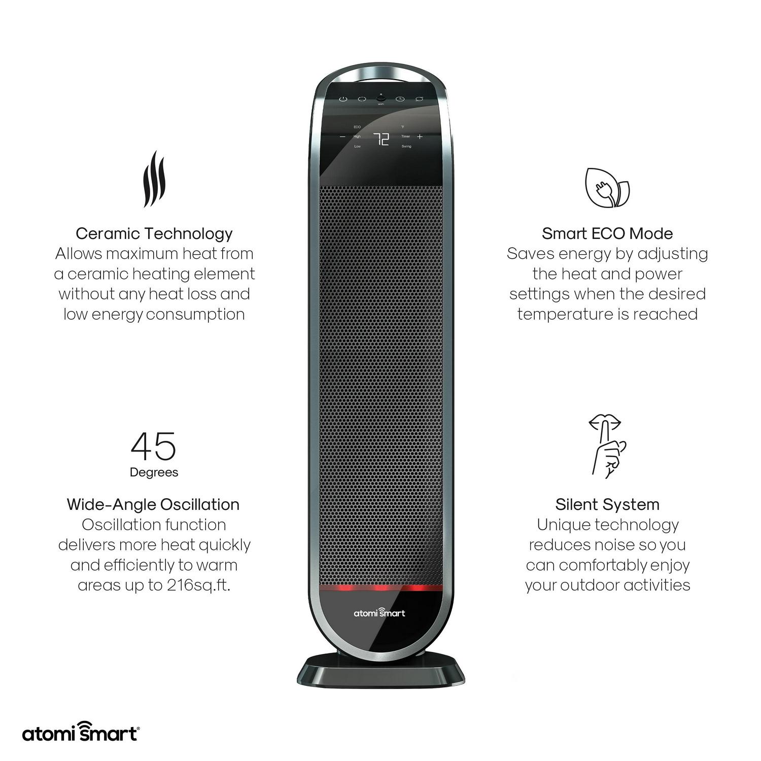 – WiFi-Enabled Control and Voice Activation – Experience the convenience of new WiFi connectivity. Control your indoor heater using the free Atomi Smart App on your smartphone, whether you’re at home or away. With simple voice commands through Alexa or Google Assistant, the Atomi Smart Tower Heater lets you effortlessly manage your indoor climate.
