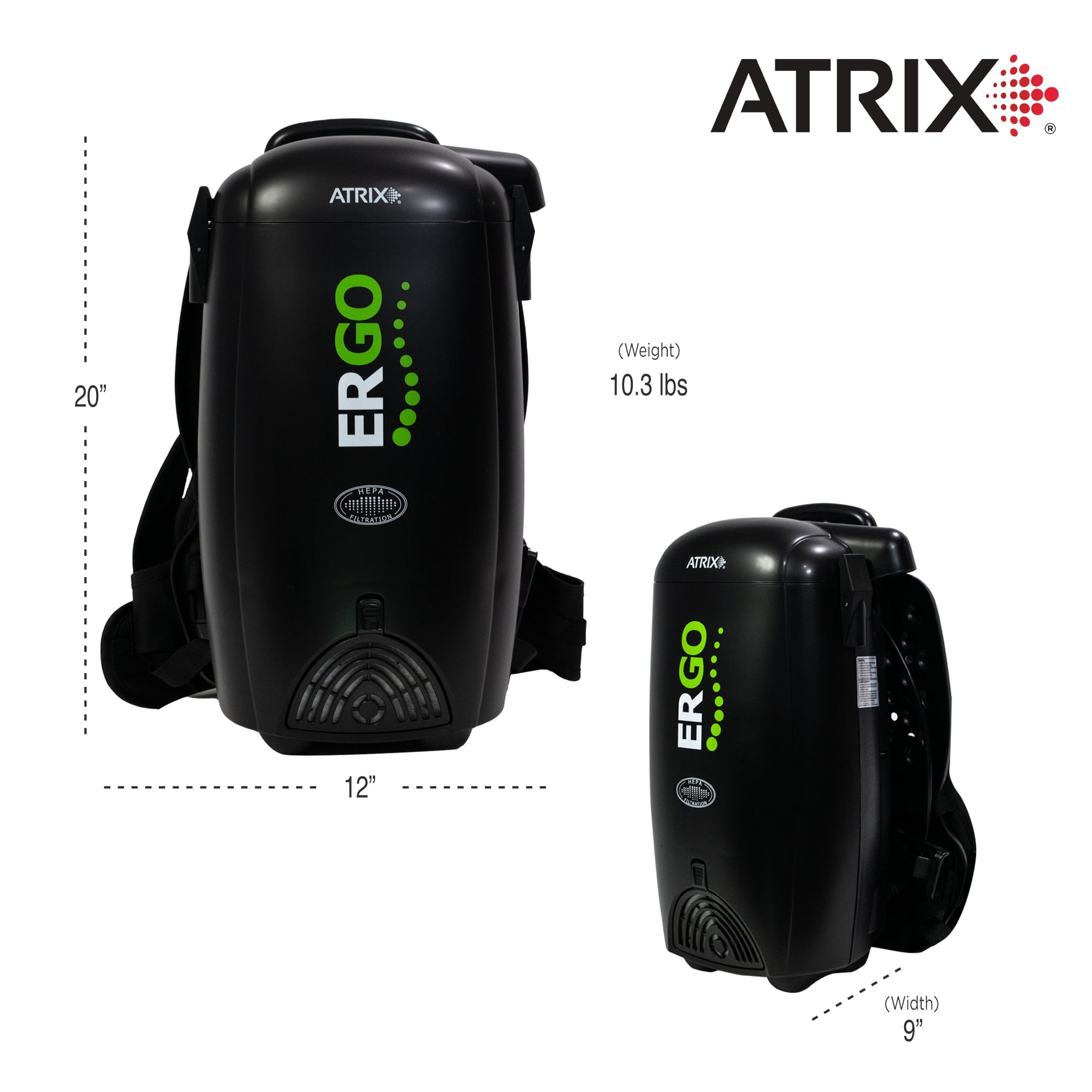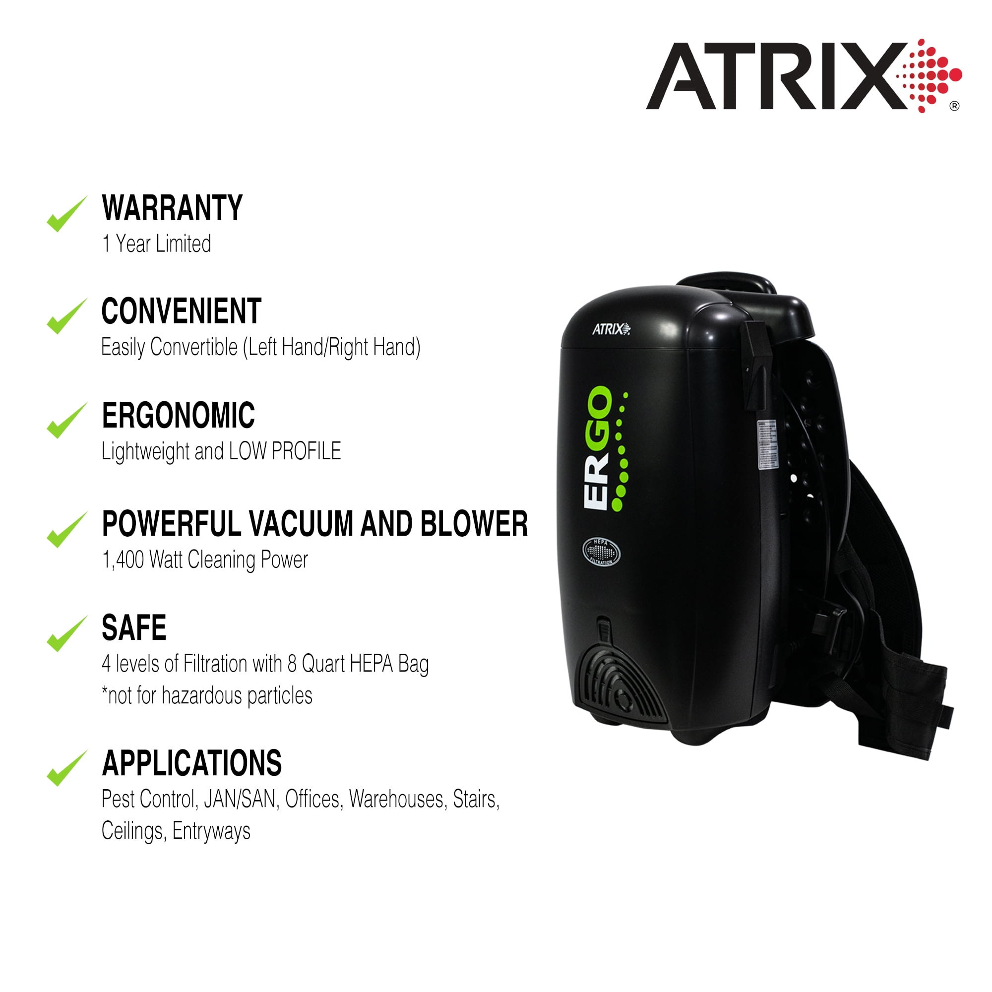 Key Features and Benefits: Quickly converts from vacuum to blower Adapts to left or right hand operation 4 stage high efficiency filtration Air powered turbo floor brush Comfortable ergonomic fit Powerful and quiet Light weight What’s Included: Atrix VACBP1 Furniture nozzle, round brush, floor brush, turbo brush, crevice nozzle, blow function nozzle